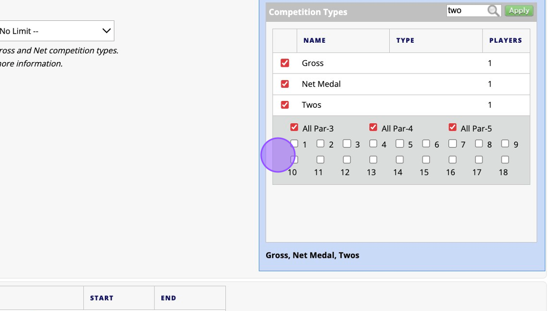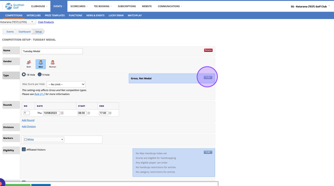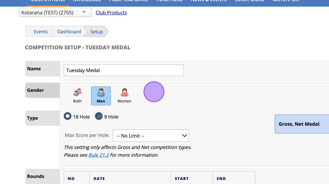 - Setting up a strokeplay competition- 1. Click "EVENTS" 2. Click on the "New" button on the day of the competition to create a competition on that day. 3. Give your competition a name and select who the event is for. 4. Click "18 Hole" if it's an 18 hole competition or "9 Hole" if ...