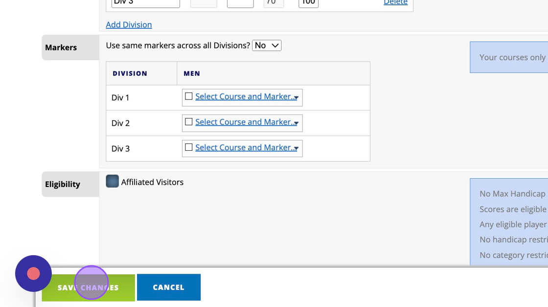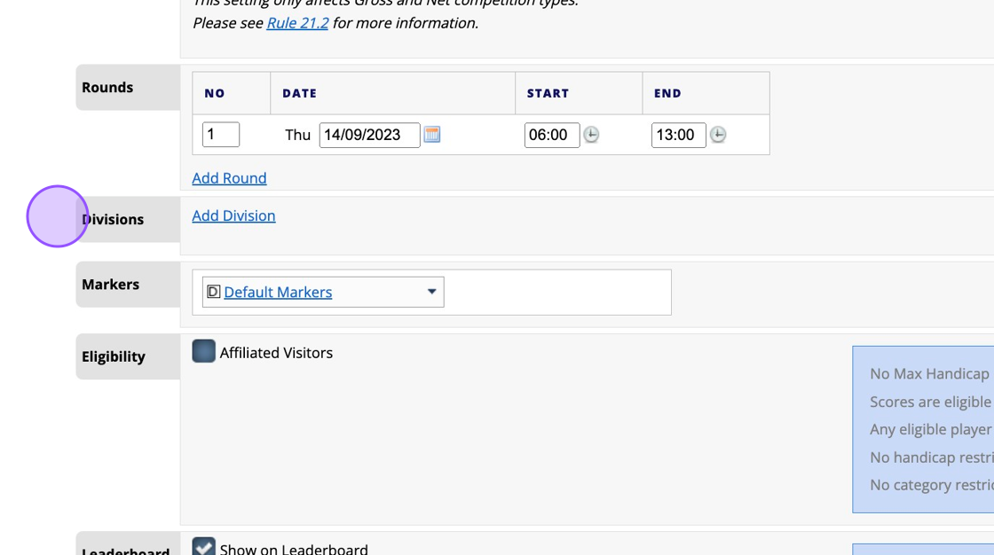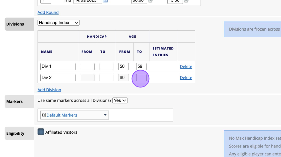 8. Important! Please ensure your division range is going to cover all competitors. If a competitior falls out with the age or handicap division they will not be able to create a card for the competition.