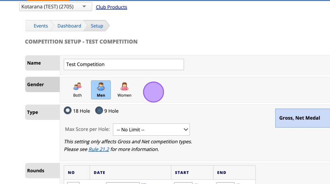 1. Click "EVENTS" 2. Click on the "New" button on the day of the competition to create a competition on that day. 3. Give your competition a name and select who the event is for. 4. Click "18 Hole" if it's an 18 hole competition or "9 Hole" if ...