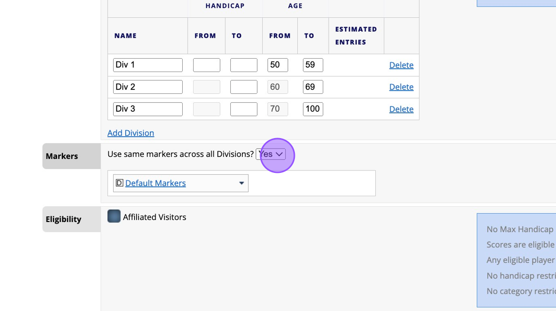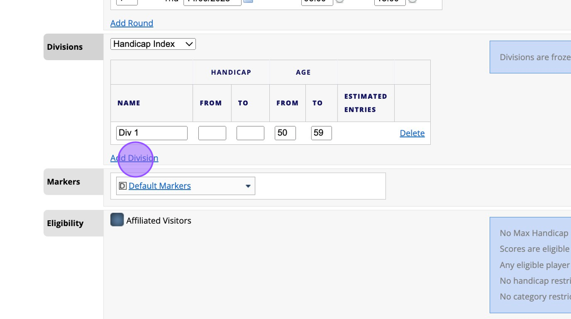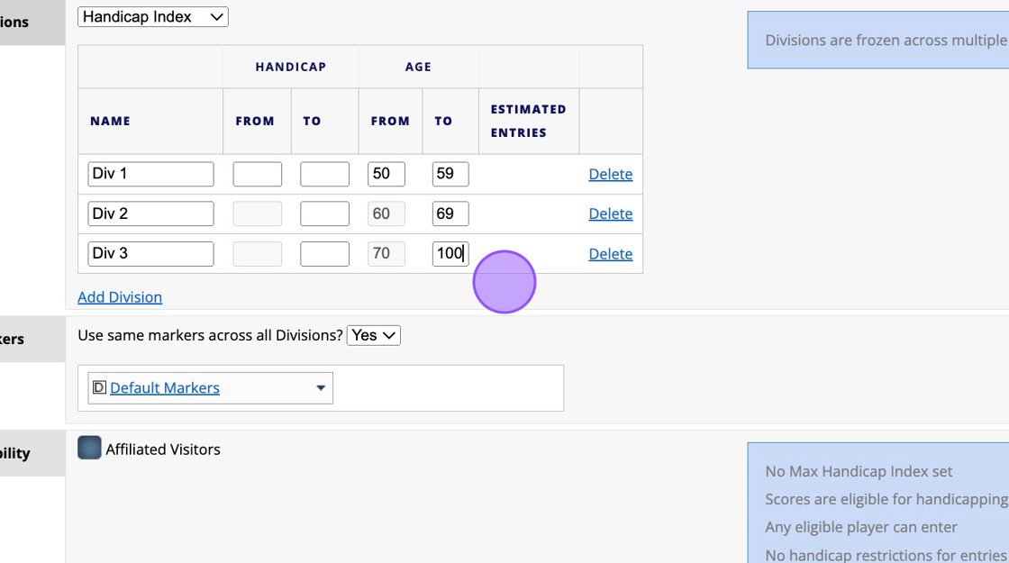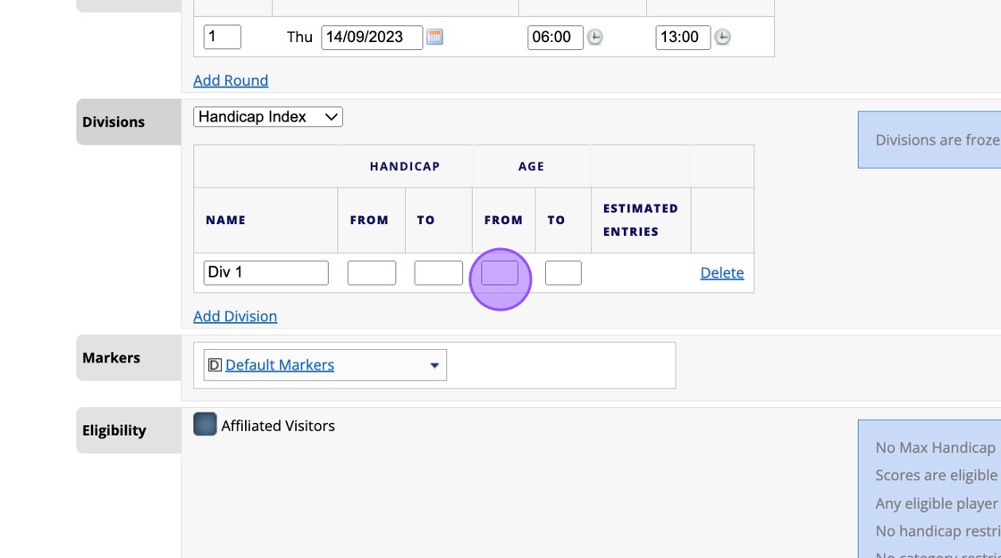 5. You'll then be able to enter the criteria for the first division (Age or Handicap).