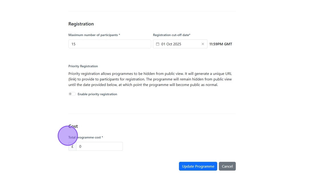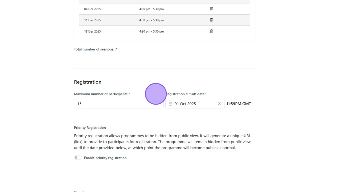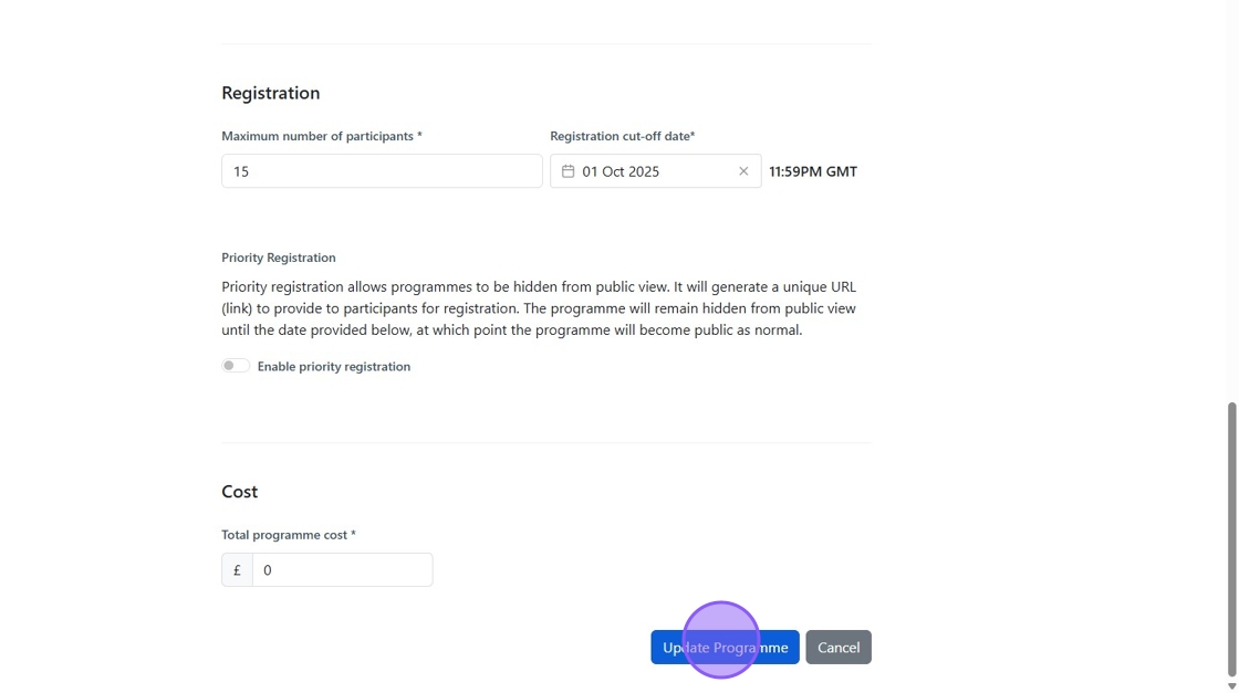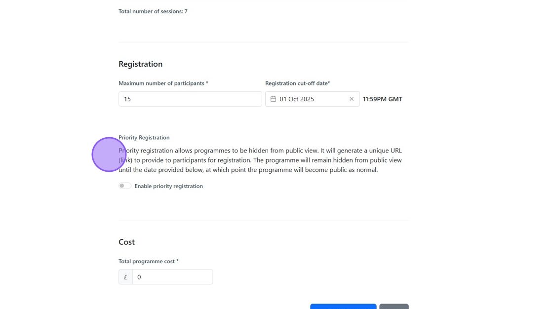 1. When setting up your Programme, you can enable priority registration which means you can share the link for the programme with your chosen participants before it goes live to the public. 2. Scroll down to the registration section. 3. And you will ...