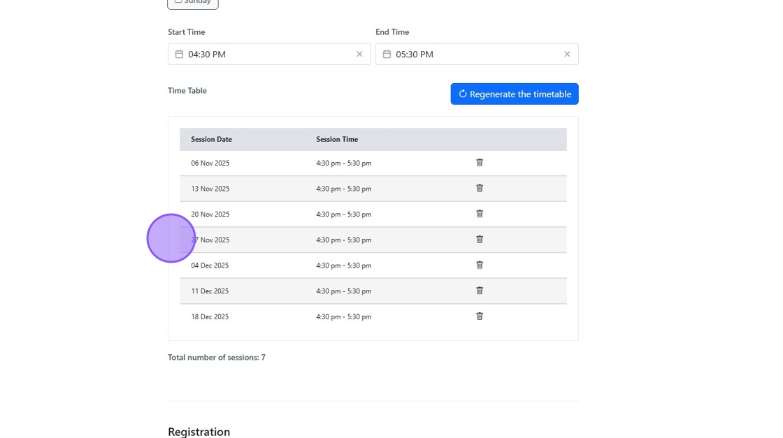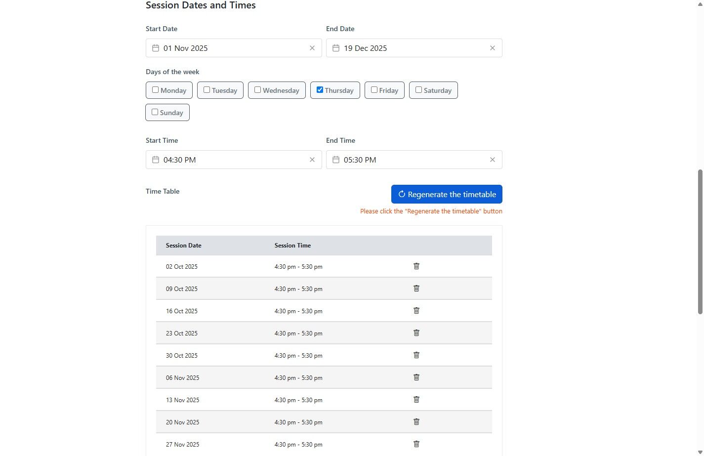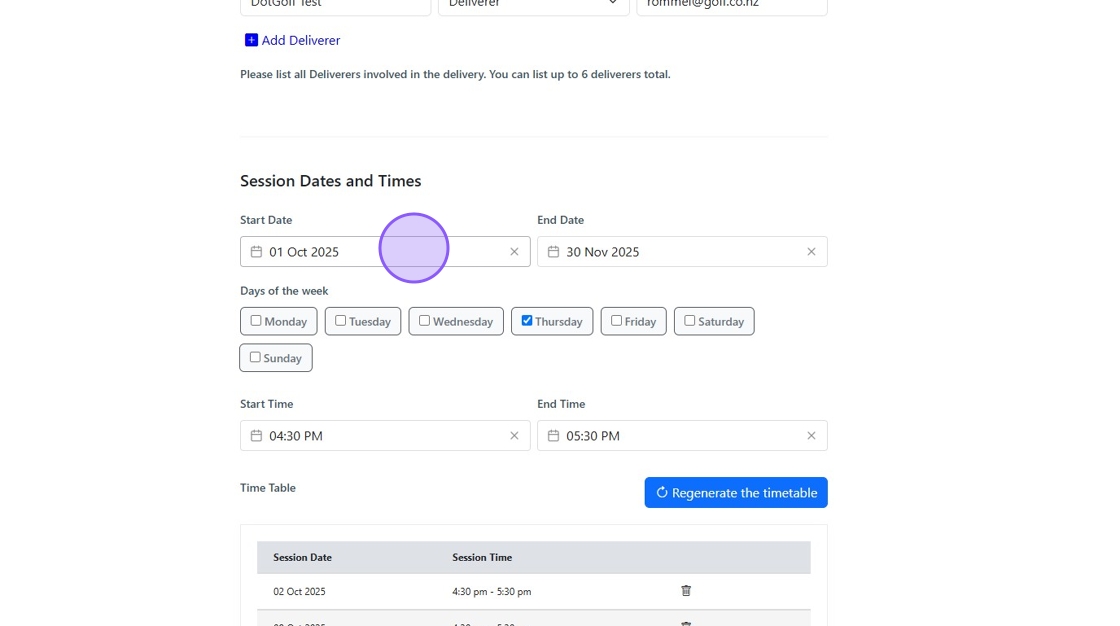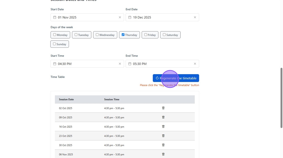 9. Once you have chosen your dates, repeating day/s of the week and session time then you can generate or regenerate your timetable.