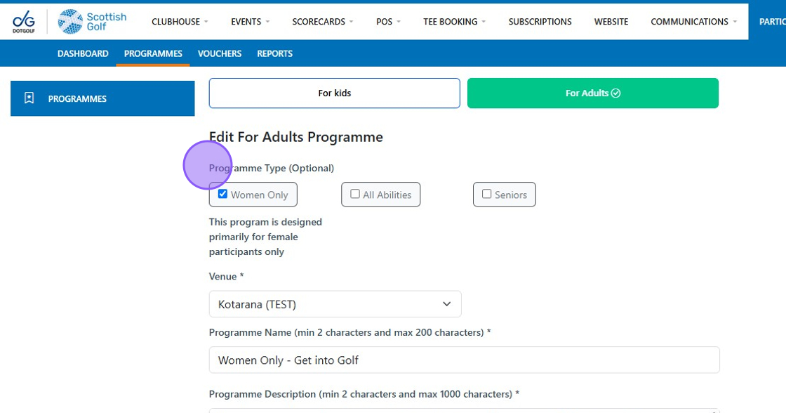 6. You will then be able to select a special programme type to tag that event. This will make it easily findable for users searching for events. You can then put in your Programme name and description.