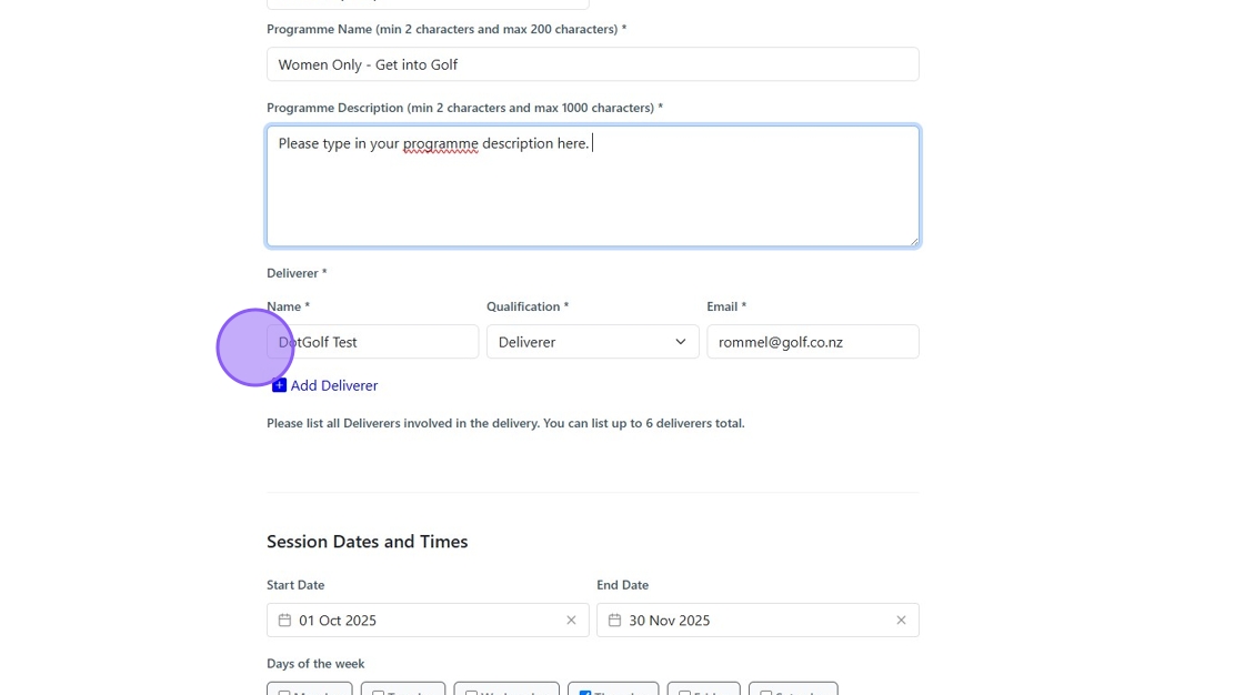 7. Please then detail your deliverer. Please remember that deliverers need to be added to Scottish Golf's central database for you to then select for your programmes.