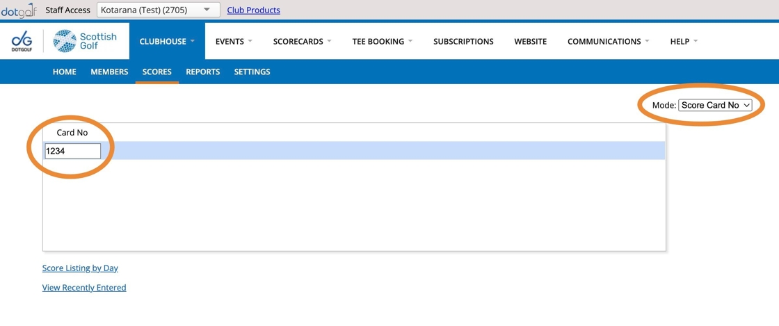 5. If you have a scorecard number, change the dropdown menu to Score Card No, and then enter the card number in the spae provided. The scorecard will then appear and you can add in the scores as normal.