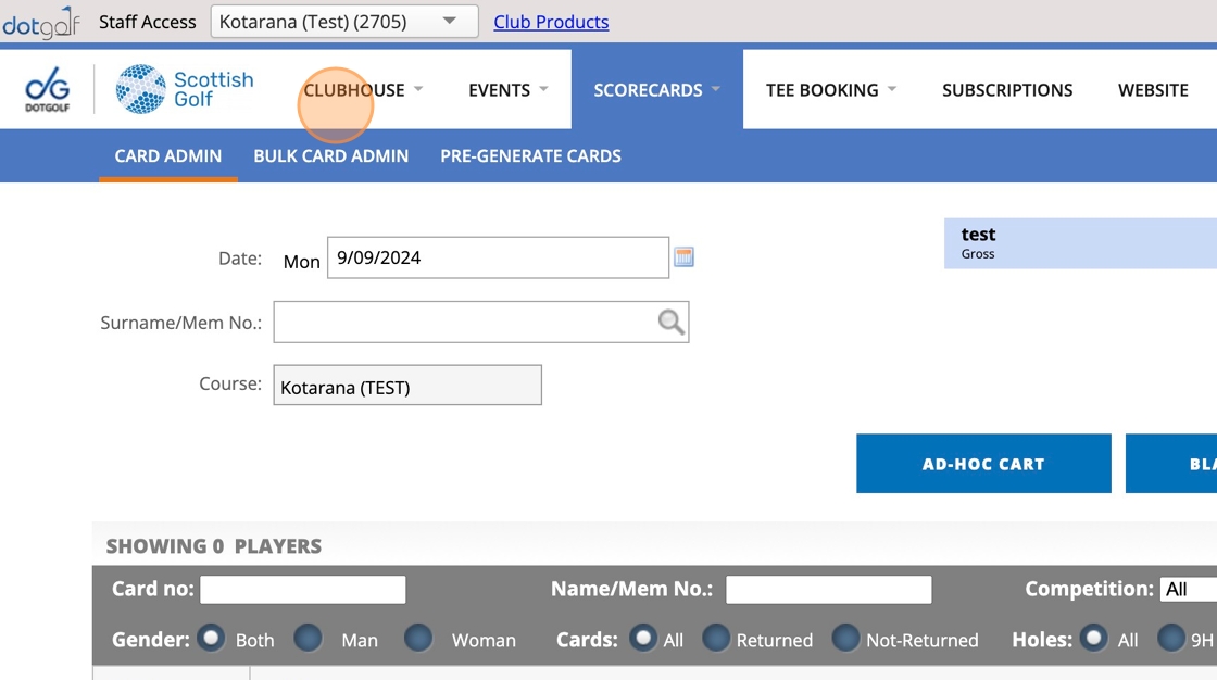 1\. Navigate to https://live.clubhouse.scottishgolf.org/TabMembers.aspx 2\. Click "SCORECARDS" 3\. Click this image.the calendar icon to change to a date played. 4\. When a scorecard is sitting in BLACK it means that the card has been created but a ...