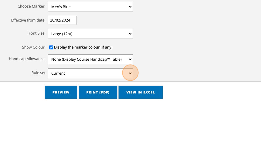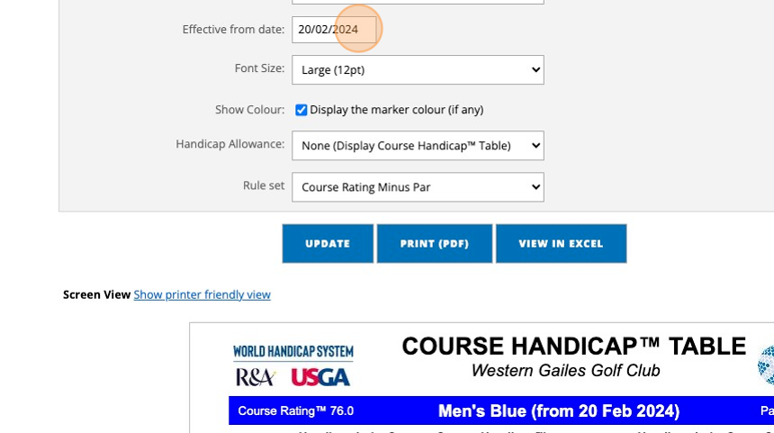 5. Change this date to 1st April 2024 and then select UPDATE - this will then display the Course Handicap Tables which can be printed out.