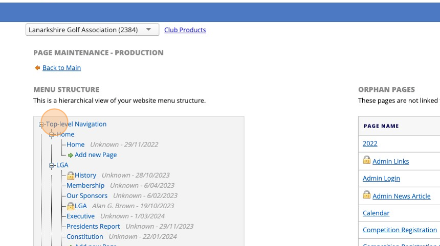 1. Navigate to https://live.clubhouse.scottishgolf.org/ClubCMS/Default.aspx?ClubWebsiteId=1080 2. To move a page in your website from one High Level section to another Click "Maintain Pages" 3. Click "Competition Results 2023" 4. Click "Detach" 5. ...