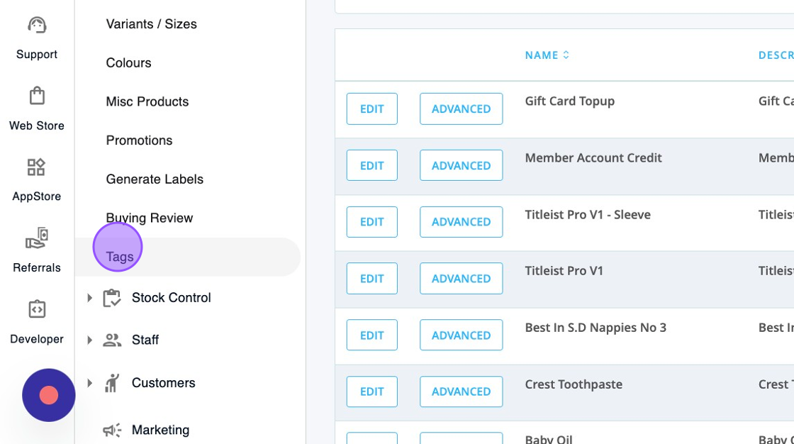 3. Click "Tags" within the Products Drop Down.