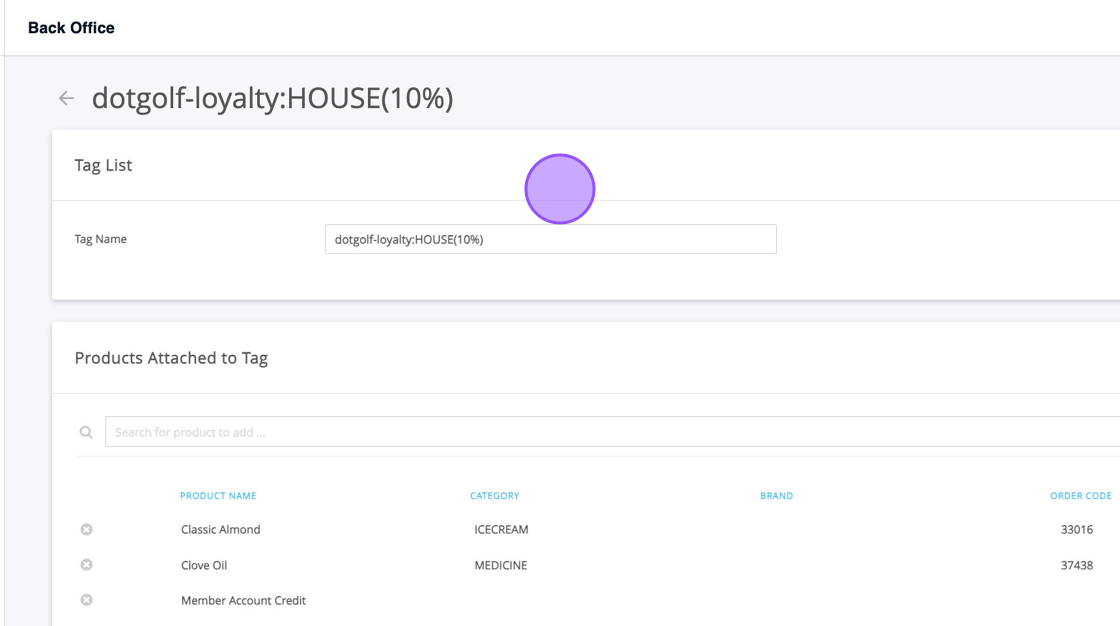 6. I can then see the products attached to this tag which means these are the products which will gain 10% loyalty when the DotGolf account is used for payment.