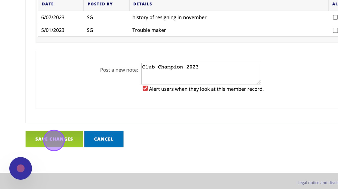 4. Click the "Alert users when they look at this member record." field for the note to be pinned to the players profile.