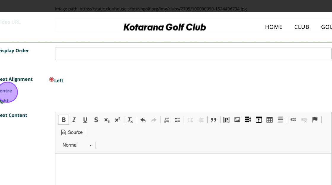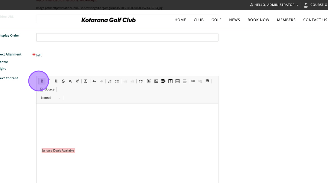 1. Navigate to https://live.clubhouse.scottishgolf.org/ 2. Click "WEBSITE" 3. Click "View site in Administrator mode" 4. Then go to the page you wish to begin editing. In this example we are editing the "HISTORY" page found within the Club section. ...