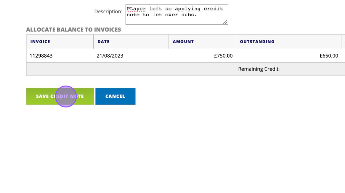3\. You'll then see any outstanding balances for you to apply the credit note.
