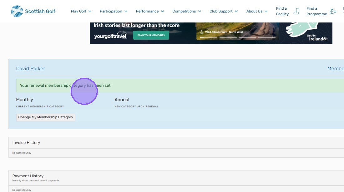 7. You will then see "Your renewal membership category has been set." as a confirmation message.