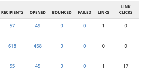 You'll also be able to click into the blue highlighted numbers to get a report on which emails received it, opened it or which emails bounced.