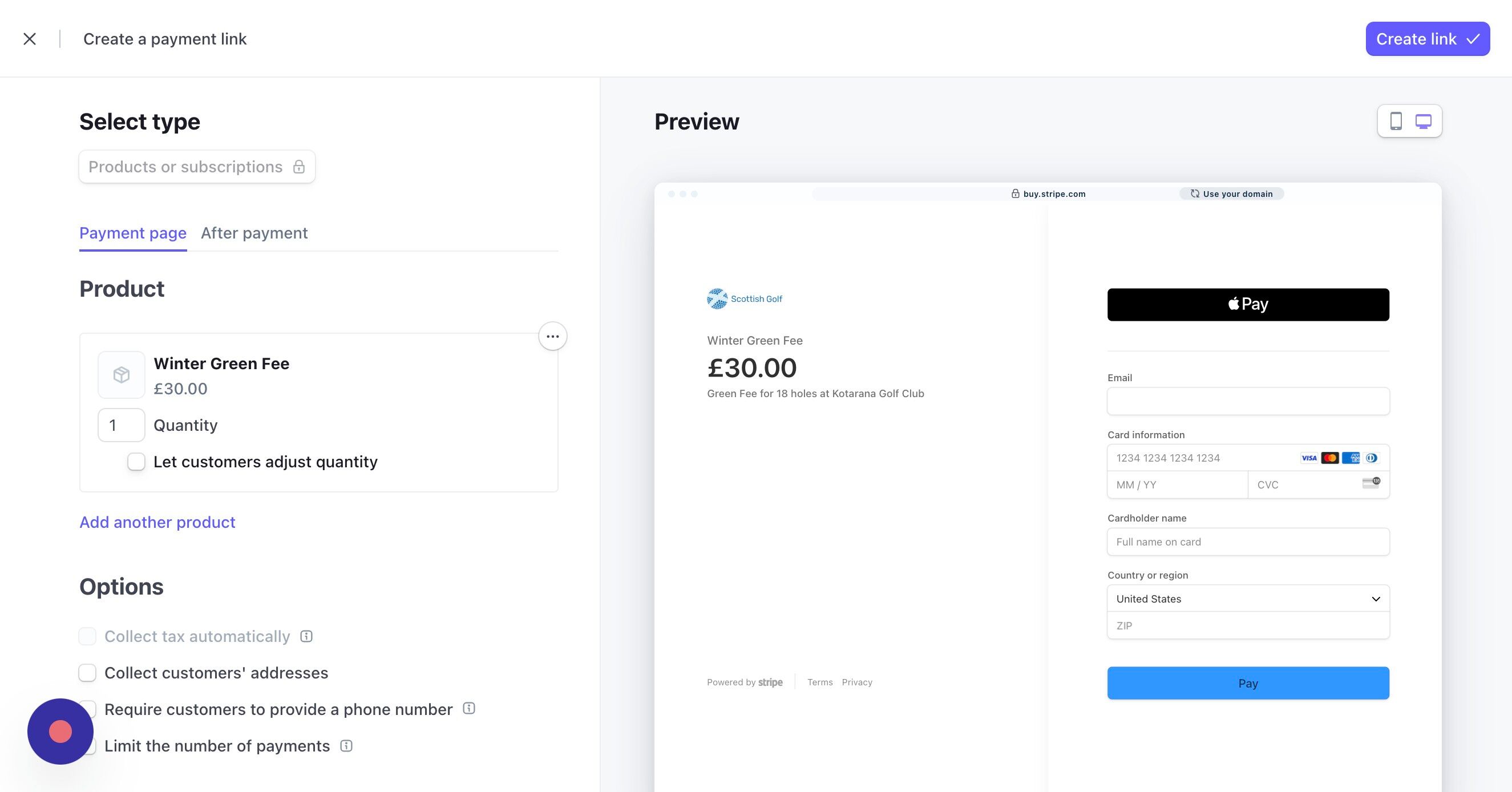 9. From here you will be able to create a unique payment link for this product. Click "Create payment link"