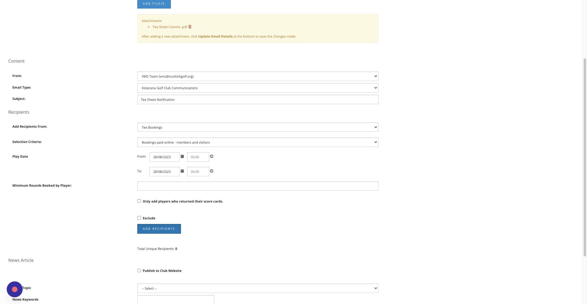 14\. Chose from the dropdown menus including setting the date and time fields that cover the tee sheet you are sending, and then "ADD Recipients"