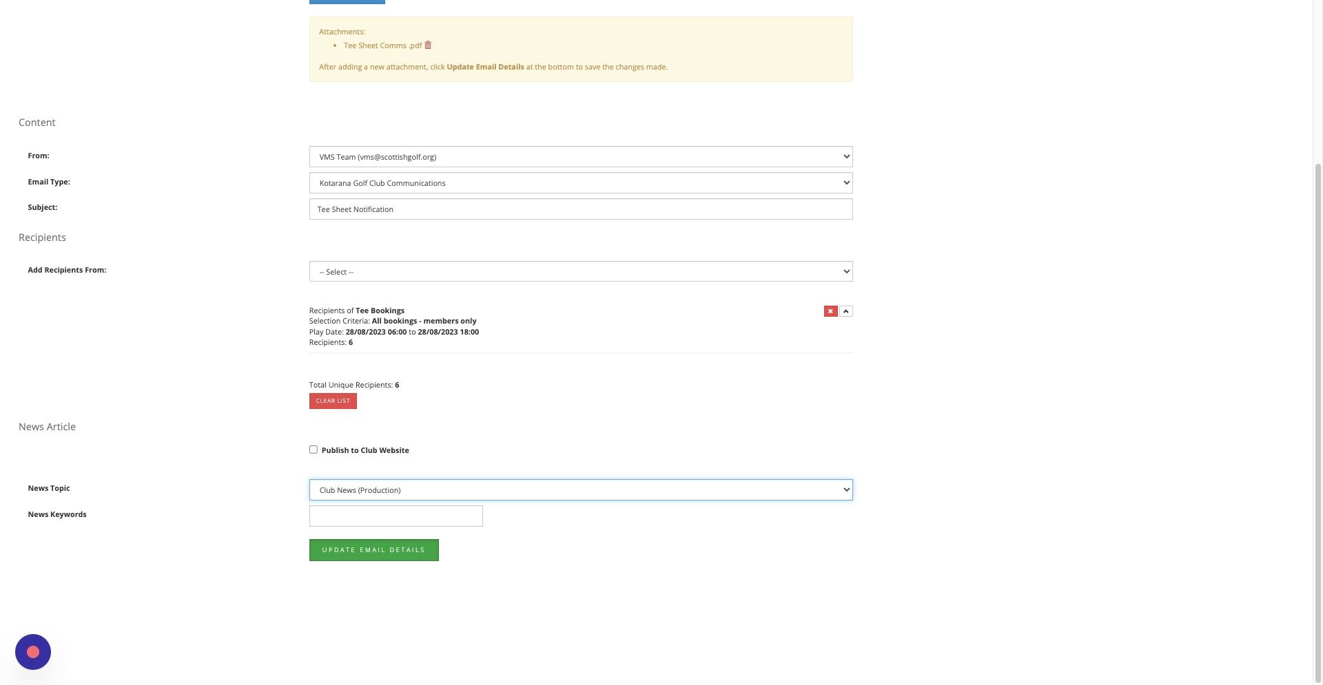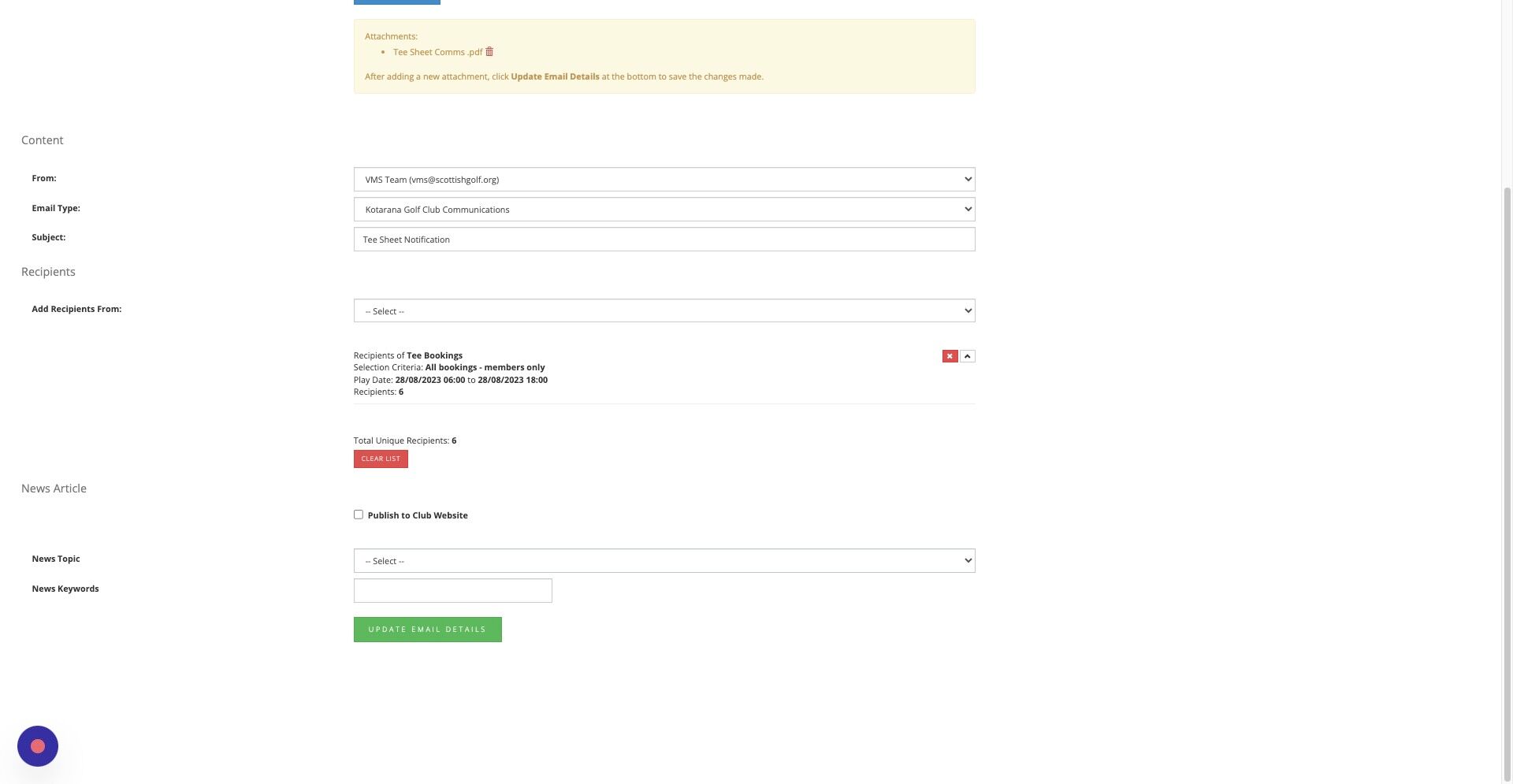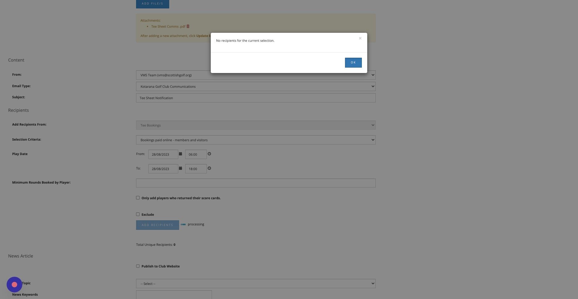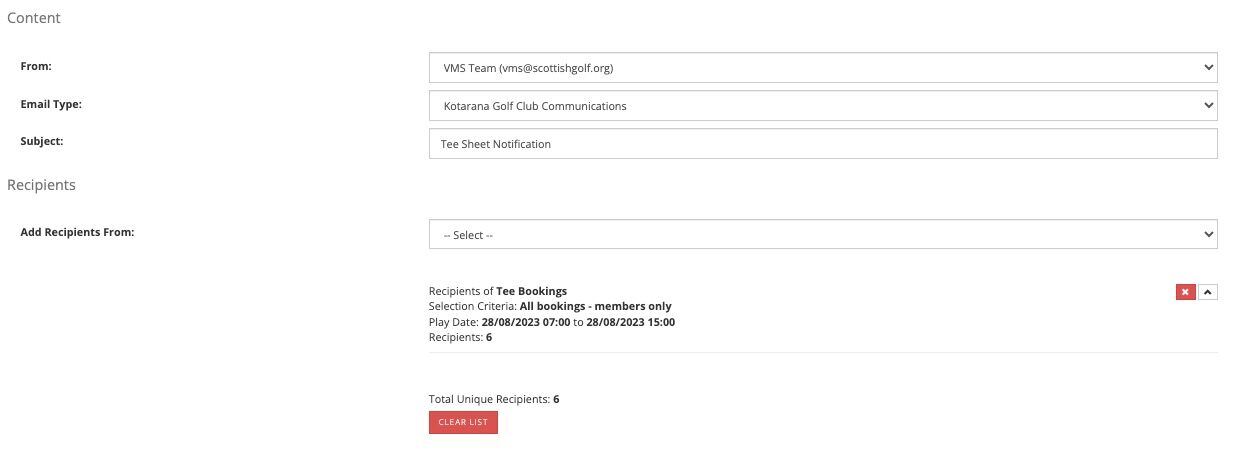 13\. Click this dropdown to chose the recipients - in this case it will be members who are booked onto the tee sheet for 28 August 2023