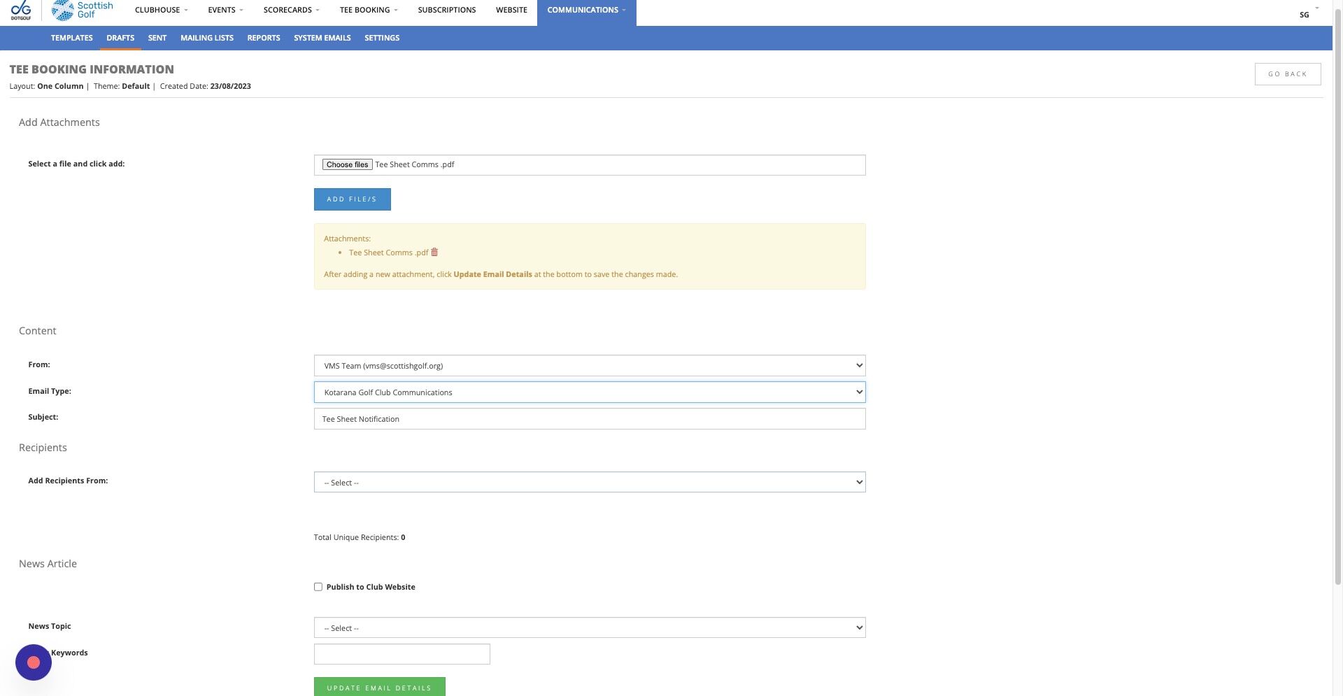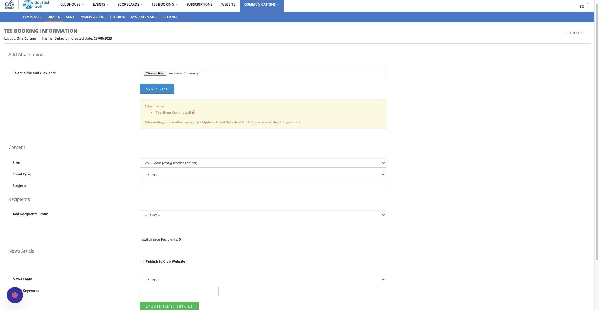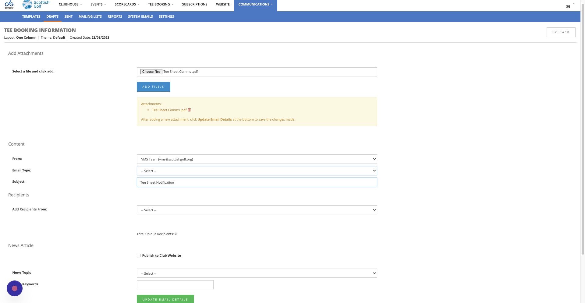 13\. Click this dropdown to chose the recipients - in this case it will be members who are booked onto the tee sheet for 28 August 2023