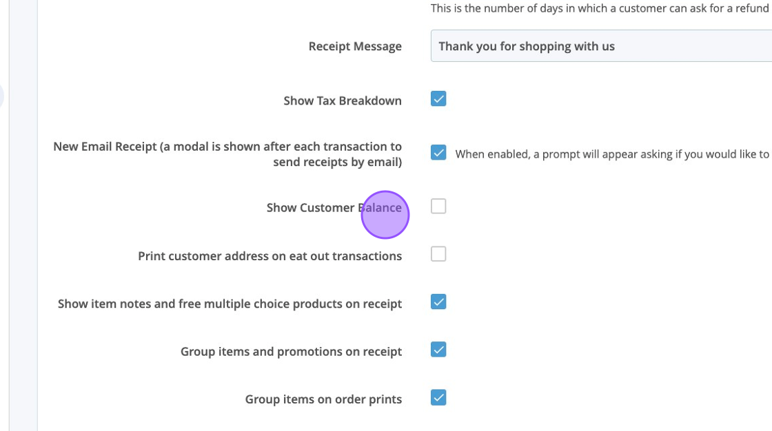 6. Click "Show Customer Balance" to remove the EposNow balance on your reciepts. This is recommend as you are unlikely to be using the EposNow Credit function and it may confuse members.