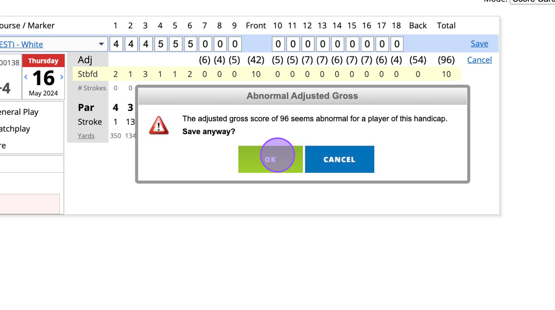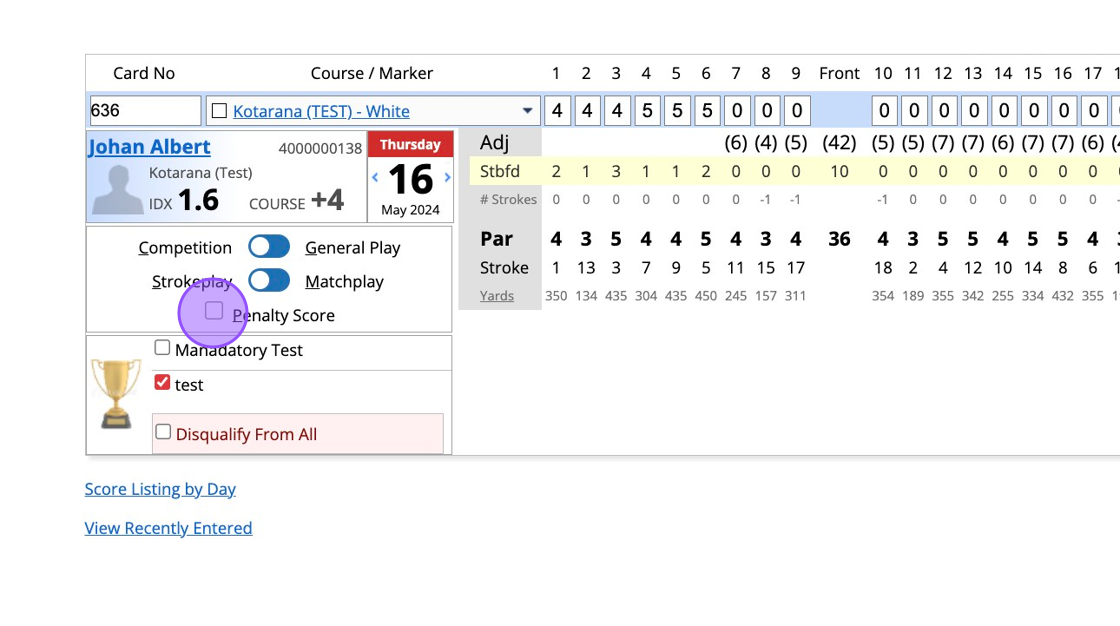 2. Type in the players scores up until they walked in. They enter 0 for the remaining holes. Tick Penalty Score so this score shows up as a penalty score on the players scoring record.
