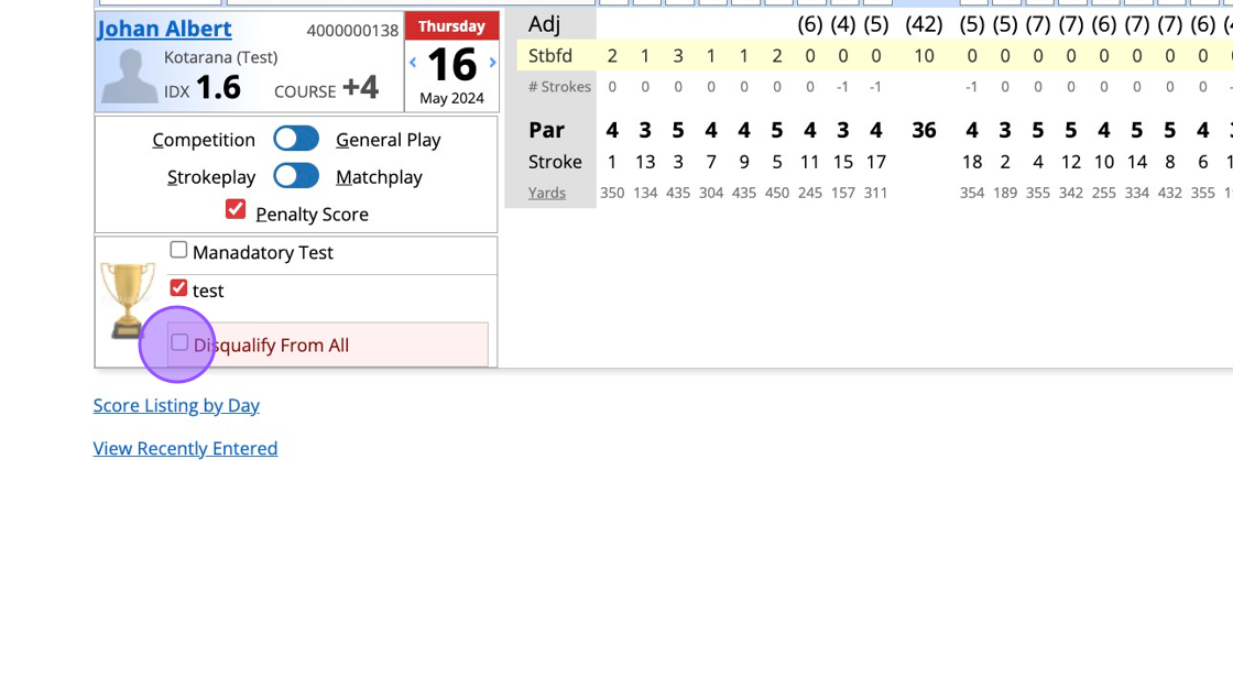 This guide advises you on how to manually disqualify a player from a competition. The example used below involves a player walking off after a small number of holes and not completing their round.