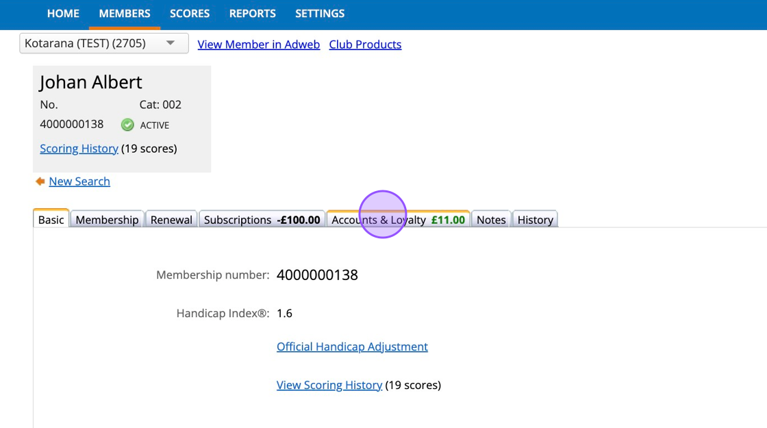 1. Navigate to https://live.clubhouse.scottishgolf.org/TabMembers.aspx 2. Click on the Member in question. 3. Click "Accounts & Loyalty" to view any existing accounts, or to open a new account. 4. Click "Open Account..." 5. Click this dropdown to see ...