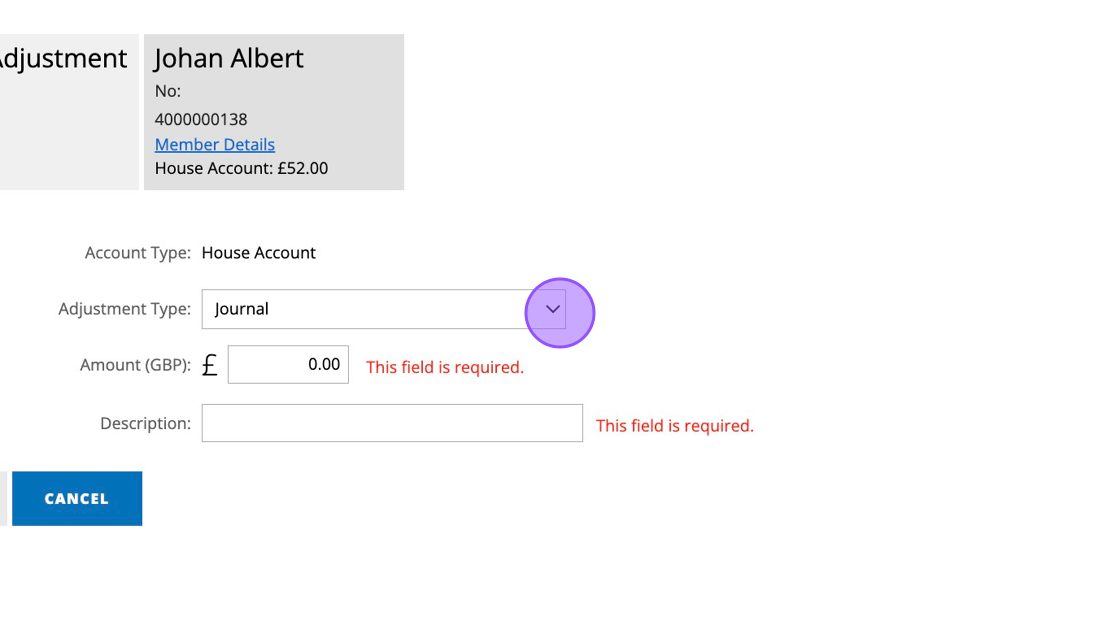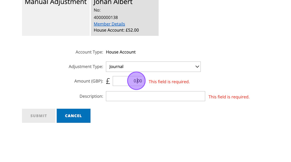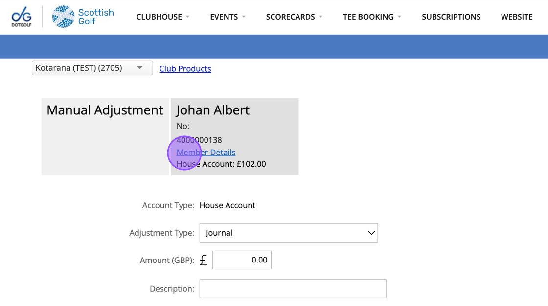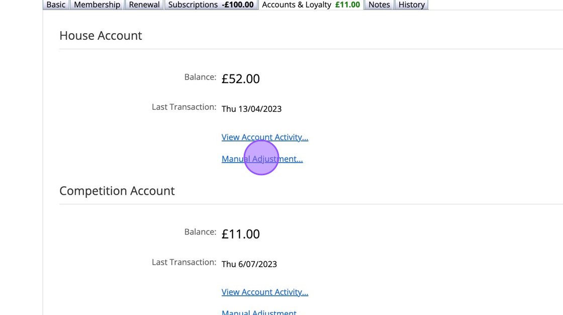 1. Go to the member you wish to manually edit their account balance. 2. Click "Accounts & Loyalty" to view their member accounts. 3. Click "Manual Adjustment..." under the account you wish to adjust 4. This drop down will give you the option to ...