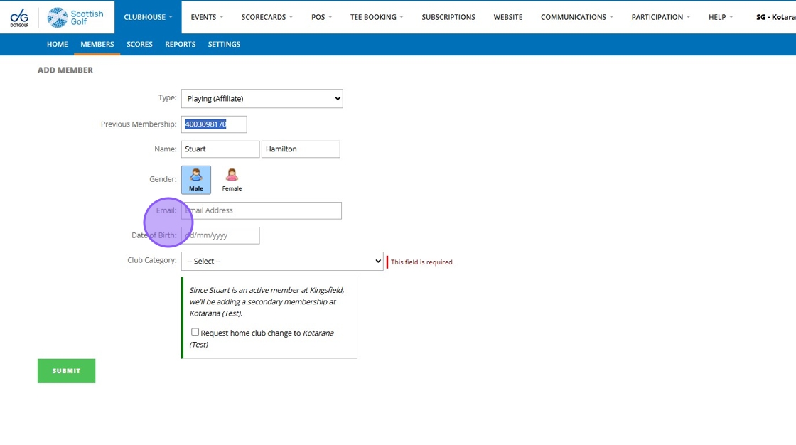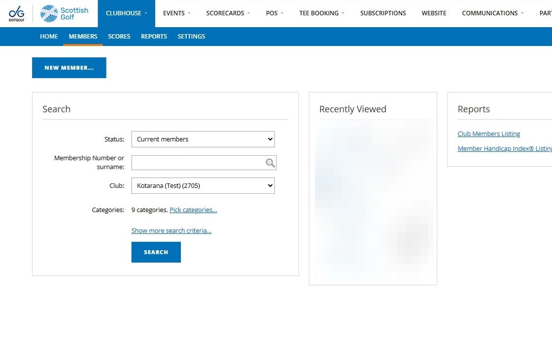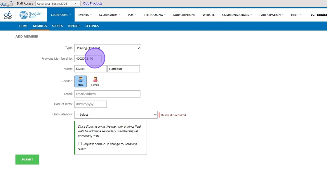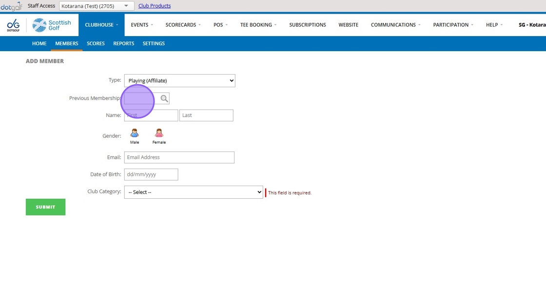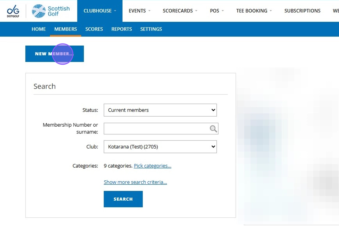 1. Navigate to https://live.clubhouse.scottishgolf.org/TabMembers.aspx 2. Click this button to add a new member. 3. You can then choose to assign a playing or non-playing membership category depending on the membership categories you have set up. 4. ...