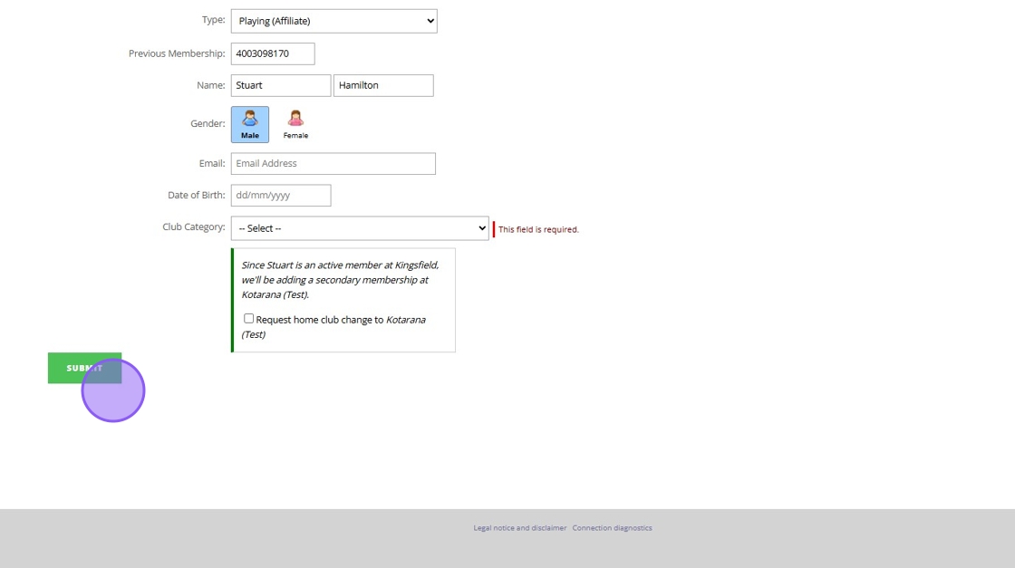 7. Then you are required to complete the remaining email and Date of Birth fields before selecting a Club category.