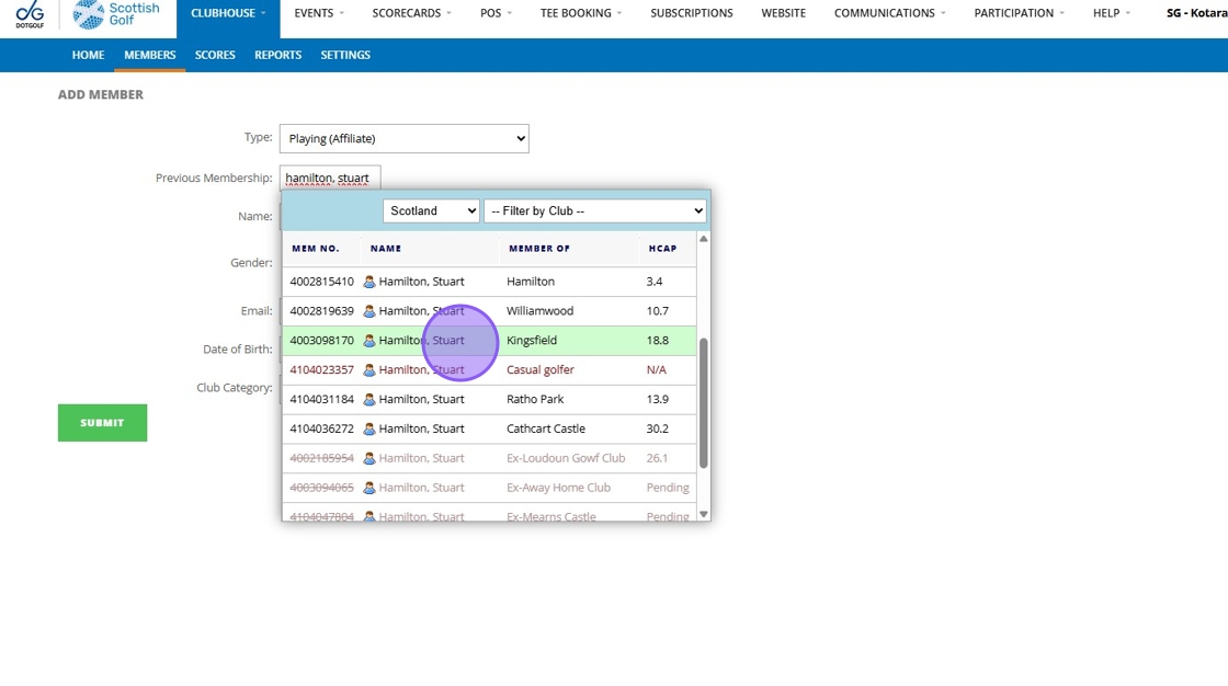 4. You can then use the "Previous Membership" field to search for existing golfers. You can type in their Scottish Golf ID or use their Surname, forename.