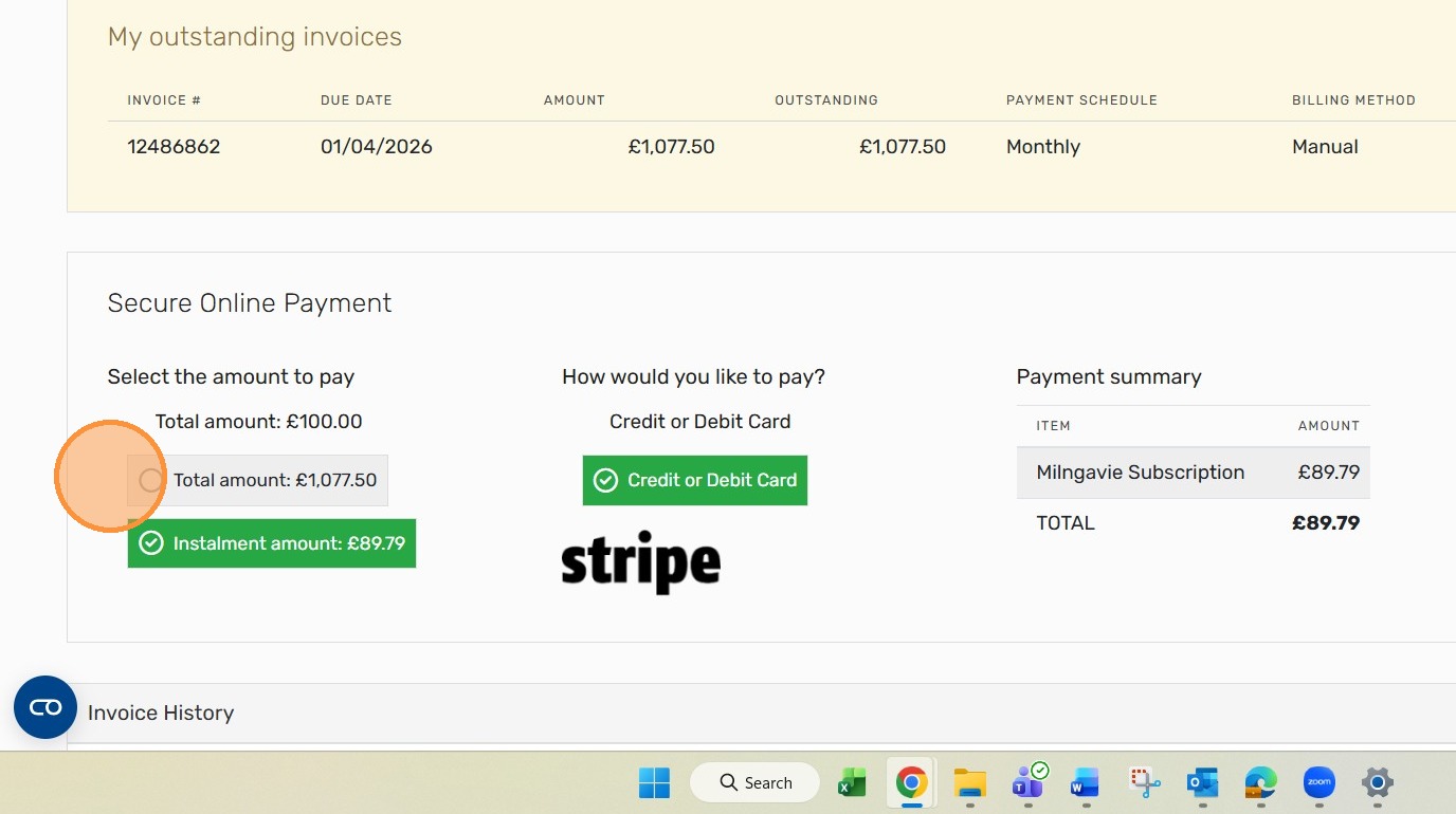 10. You now need to activate your subscription payments. In this image the member has asked to pay by installments but if you wanted to pay a single payment that option would be highlighted
