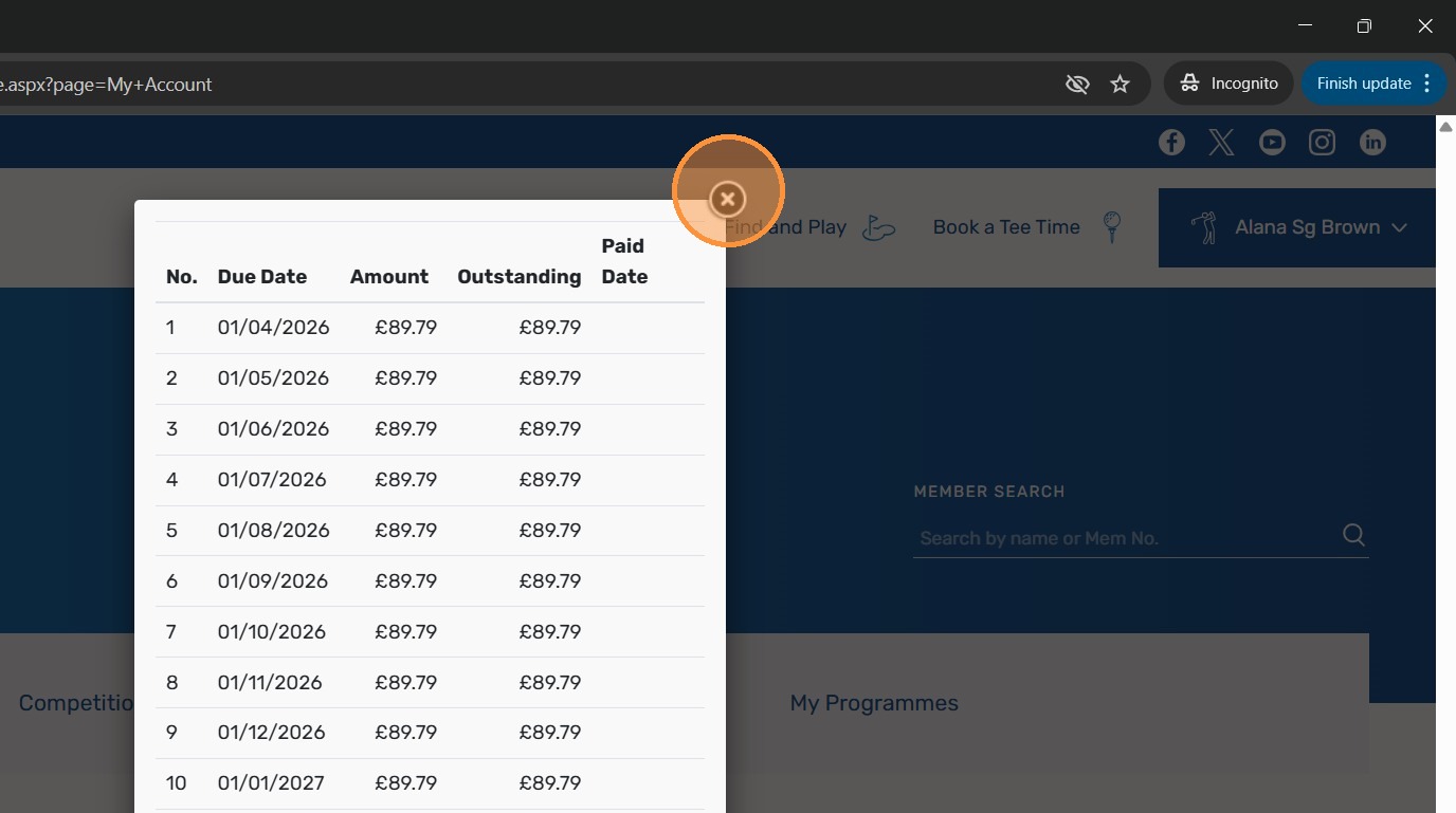 8. You will now have access to your profile and if your subscription invoice has been issued by the club it will be here - If you opted to pay in installments you can see the payment dates by Clicking "Instalment schedule"