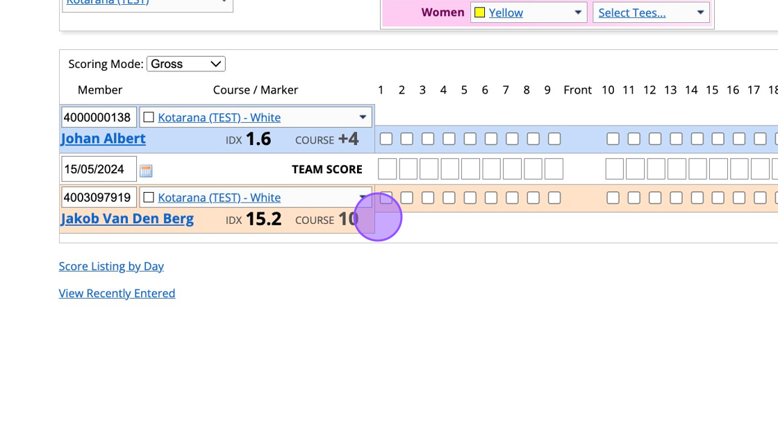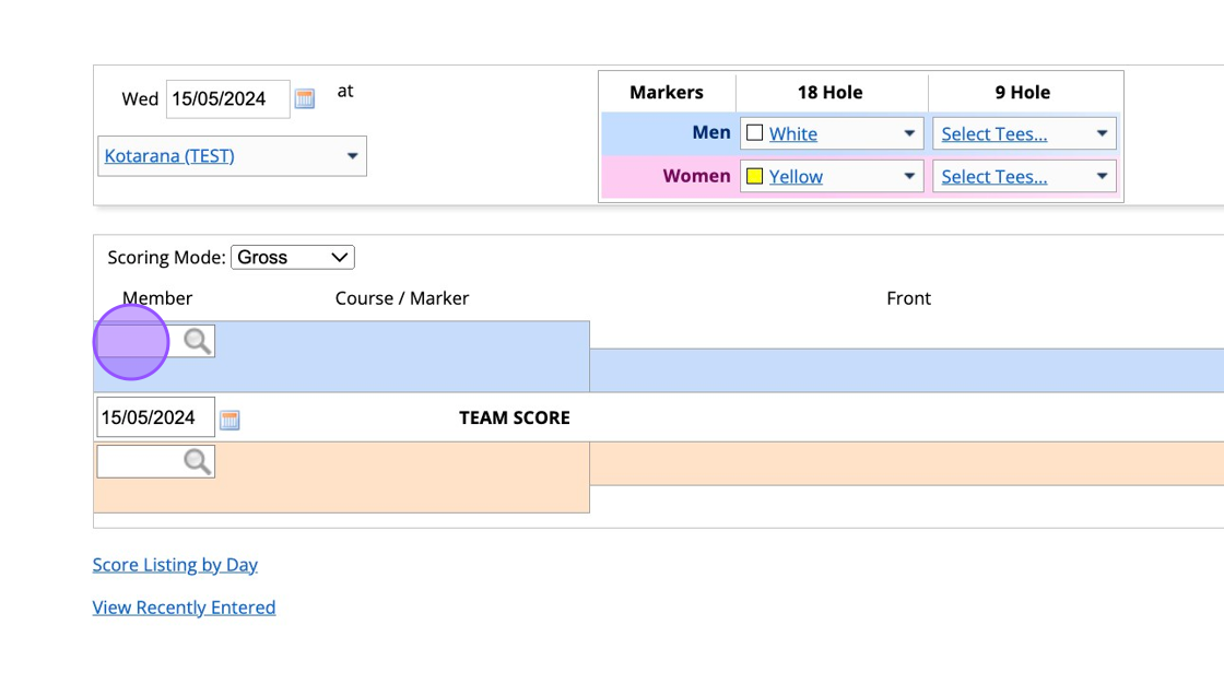 6. You'll also be able to change the date of play and the markers used if needed by clicking on the appropriate drop downs. You can also see the players Handicap index and Course Handicap.
