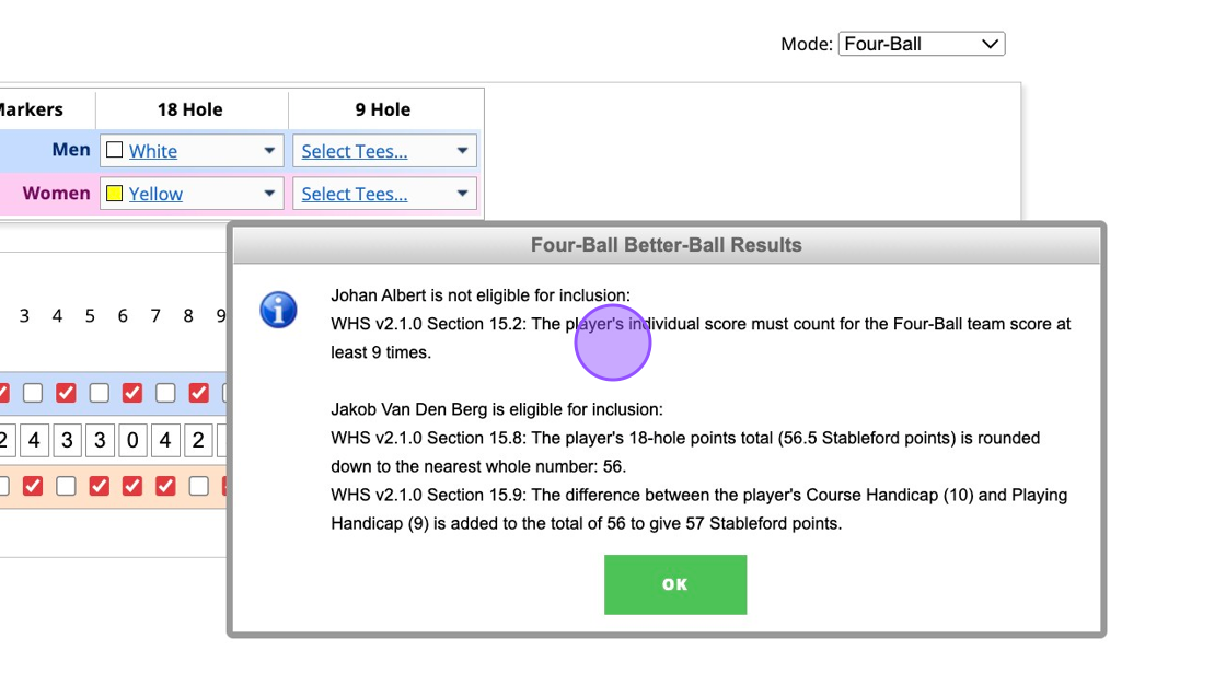 10. Click save to see a confirmation box of eligibility and confirmation of which player now has an eligible score for handicapping purposes.