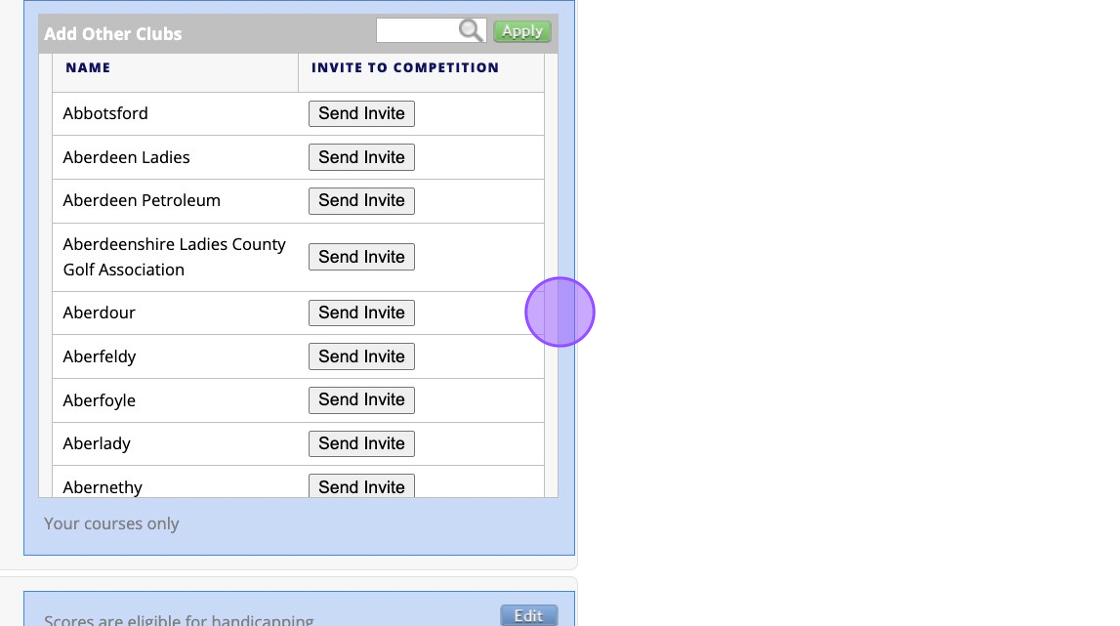 8. You'll then see a list of clubs where you can send an invite to gain access to that Tee information. Please note that the club in question will need to accept your request for you to use that course information.