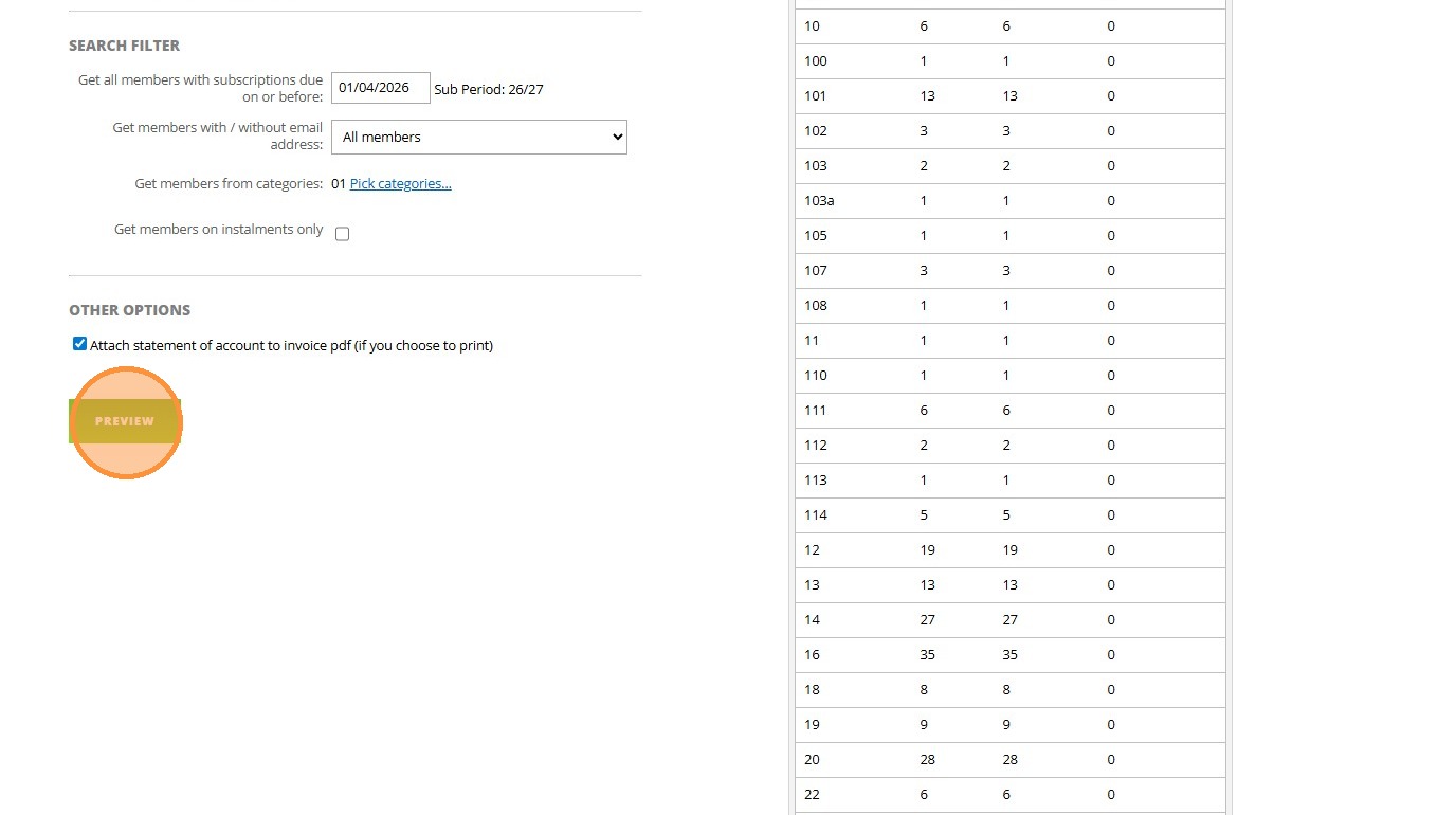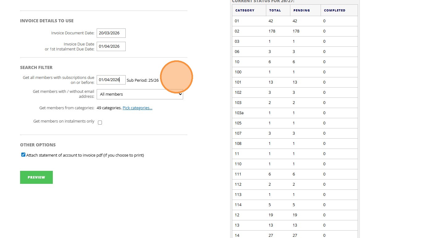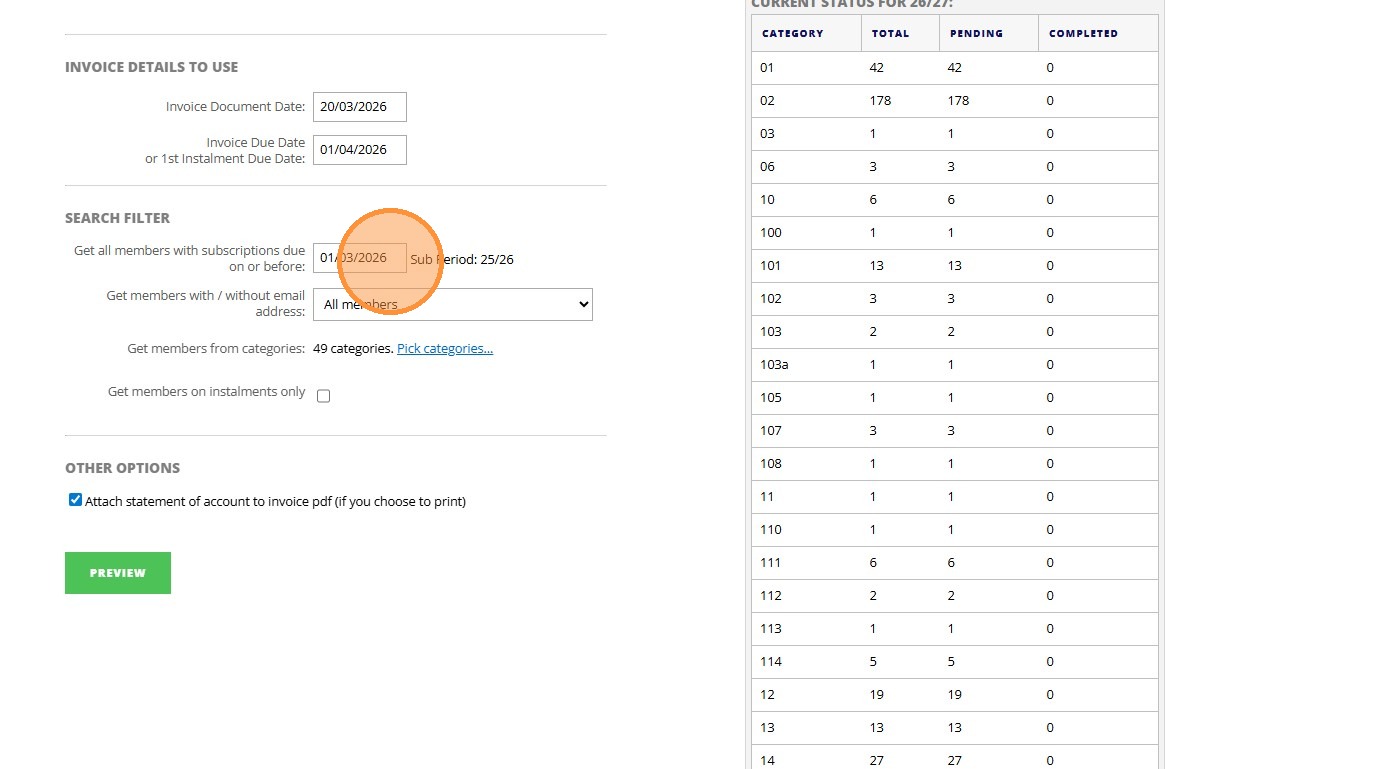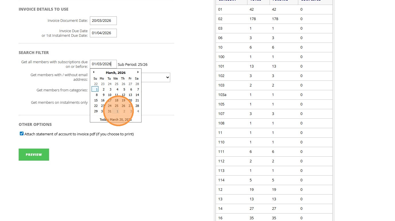 8. Click "Invoice Details To Use Invoice Document Date: Invoice Due Date or 1st Instalment Due Date: Search Filter Get all members with subscriptions due ..."