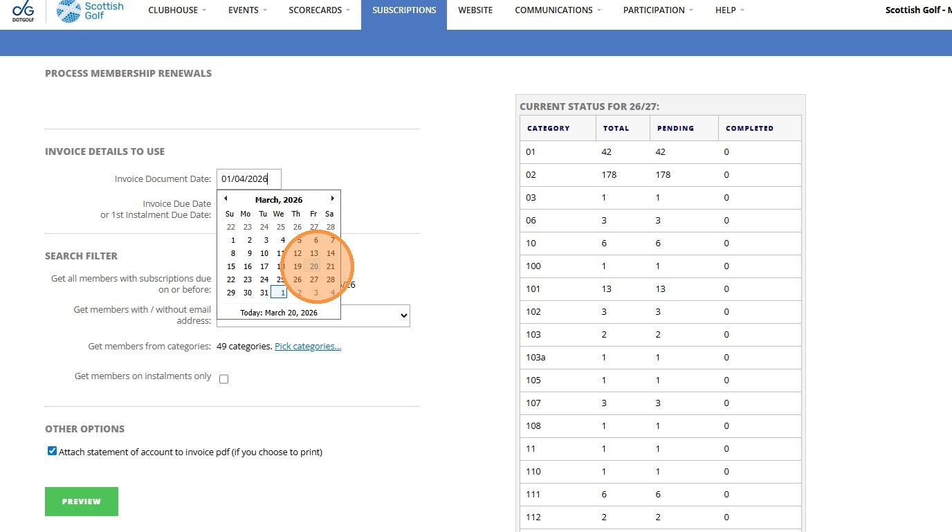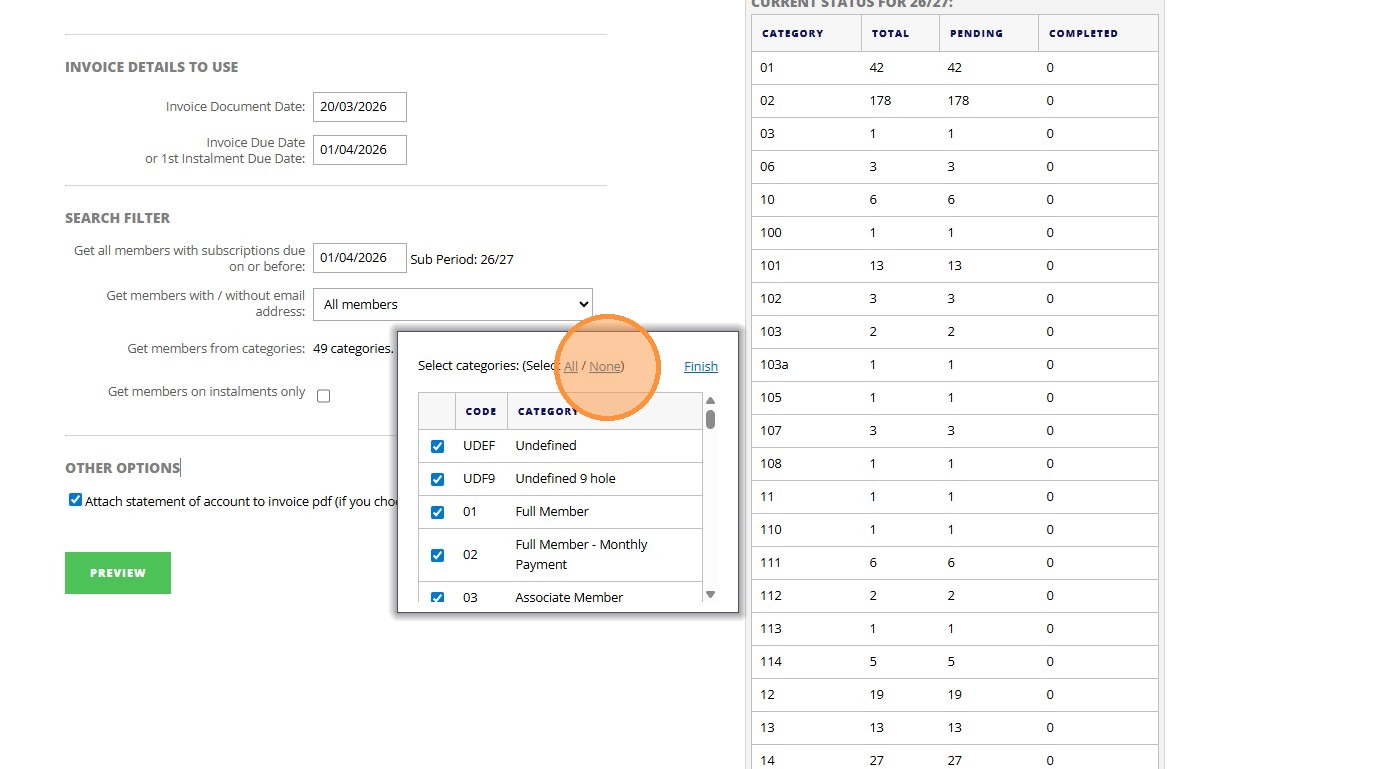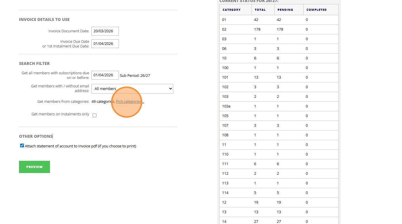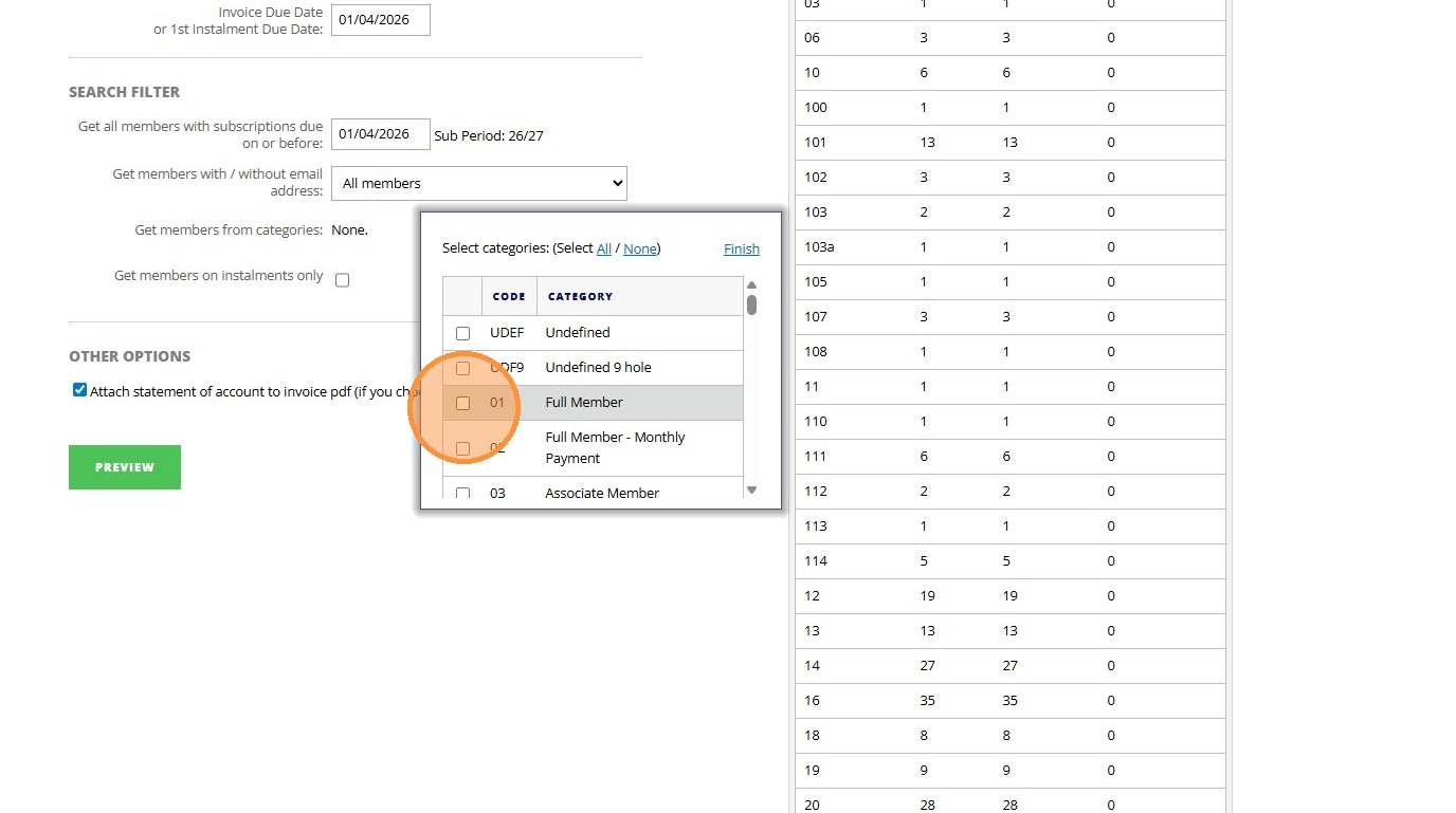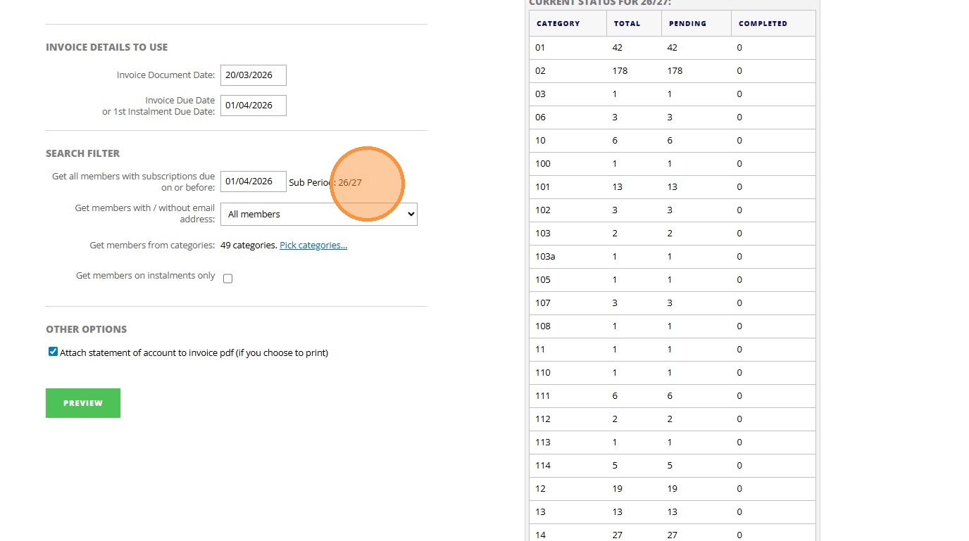 8. Click "Invoice Details To Use Invoice Document Date: Invoice Due Date or 1st Instalment Due Date: Search Filter Get all members with subscriptions due ..."