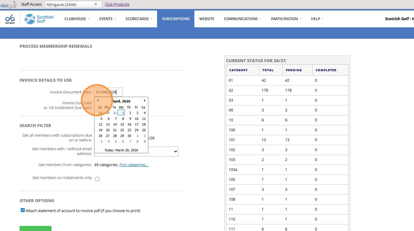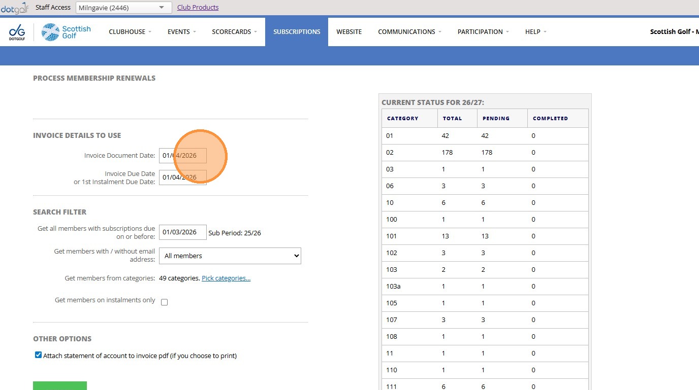9. Click "Invoice Details To Use Invoice Document Date: Invoice Due Date or 1st Instalment Due Date: Search Filter Get all members with subscriptions due ..."