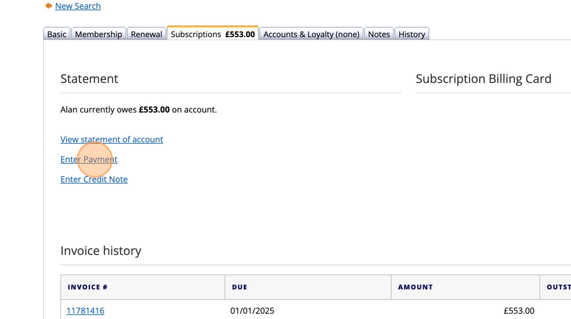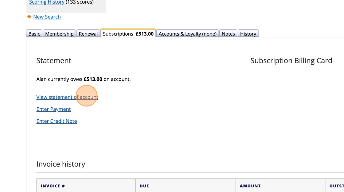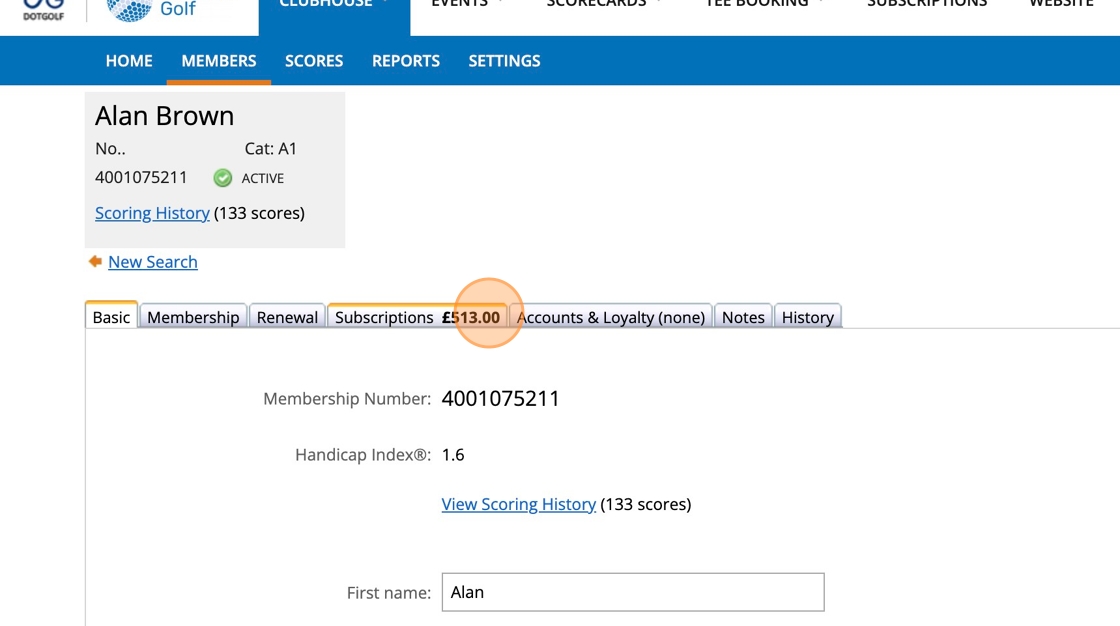Recording a Subscription Payment on the Scottish Golf Clubhouse in a Members Profile