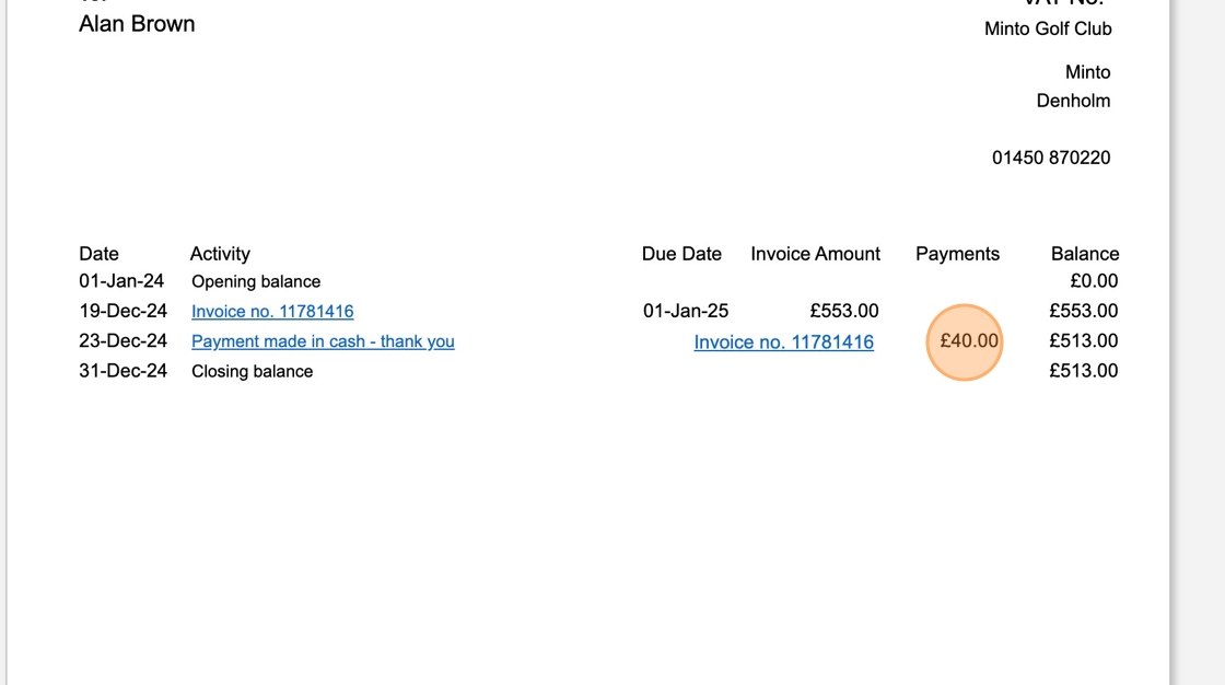 7. You can see now that the £40 has been deducted from their outstanding bill leaving £513.00 to pay.