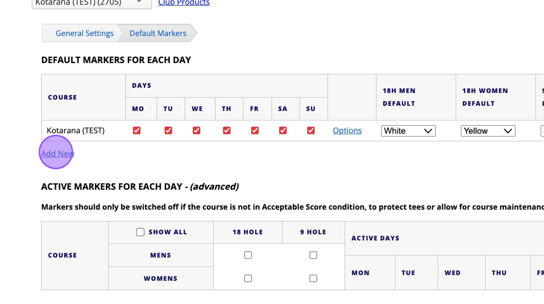 3. To add a default marker click on "Add New" and choose the course you wish to apply the default markers to.