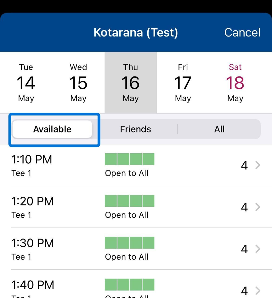 16. Now when a user goes into the Tee Booking section of the App. They will not see any mandatory tee time within the Available section. This is to discourage players booking tee times instead of entering the competition.