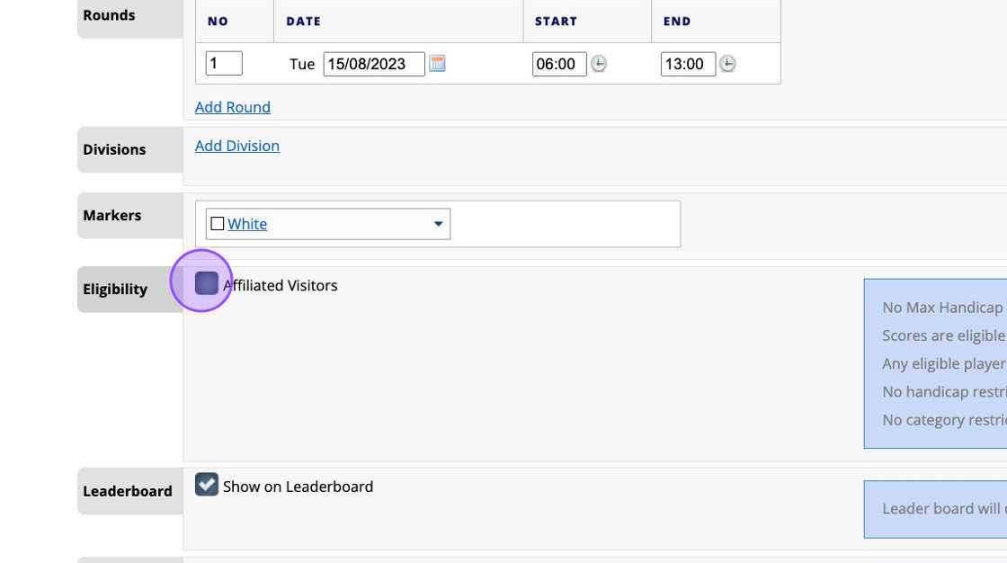 5. Click "Affiliated Visitors" to open up the competition to players outside of your membership