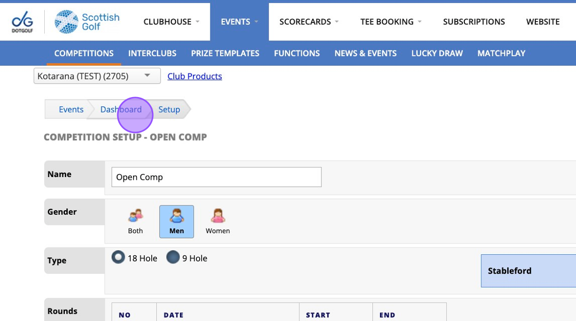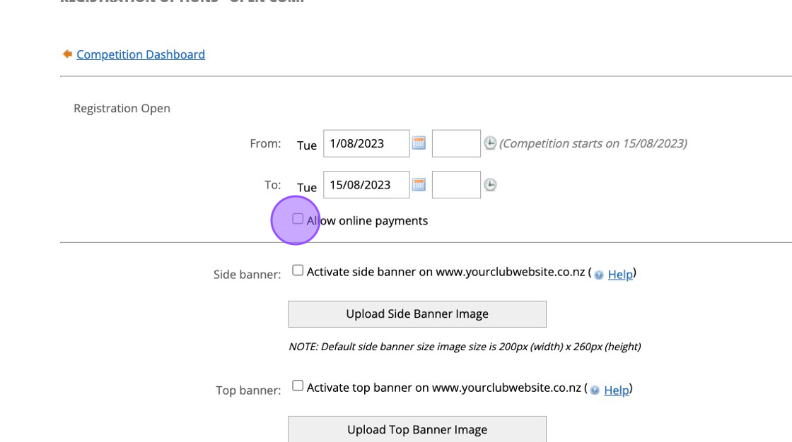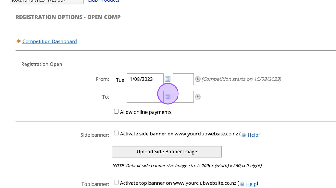 10. Click "Dashboard" so we can now enter your registration opening and closing times.