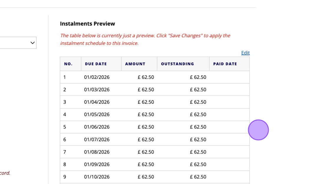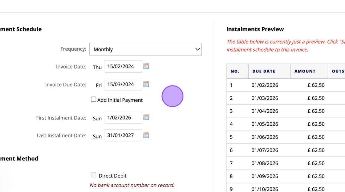 9. Once your preferred payment schedule is selected you will then be able to set the instalment dates and view a preview on the left hand side. This may be useful for players joining mid year or after the 1st instalment date.