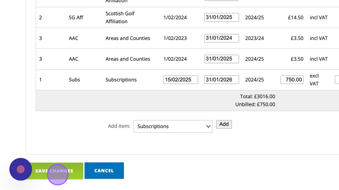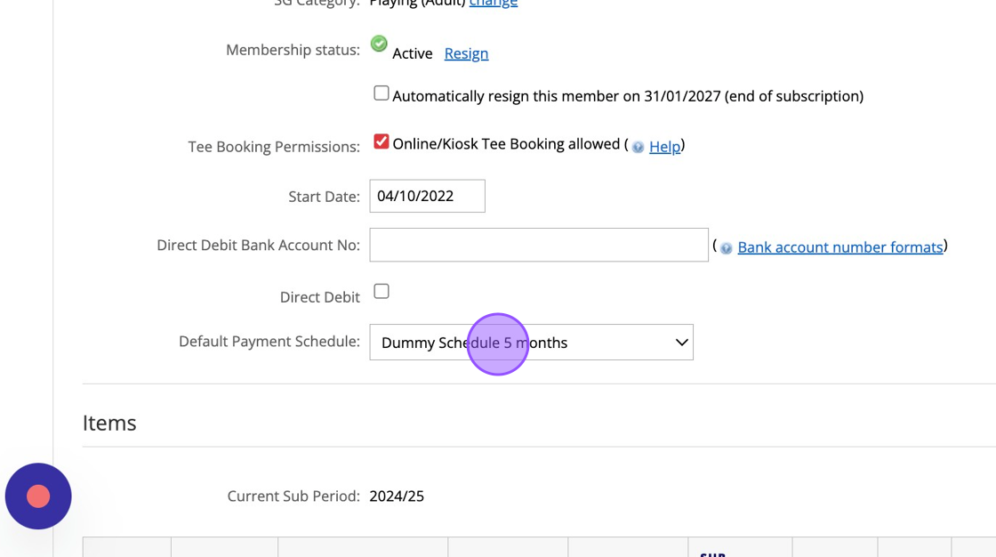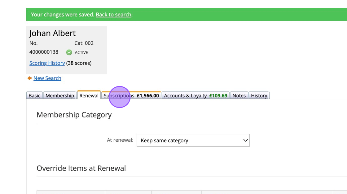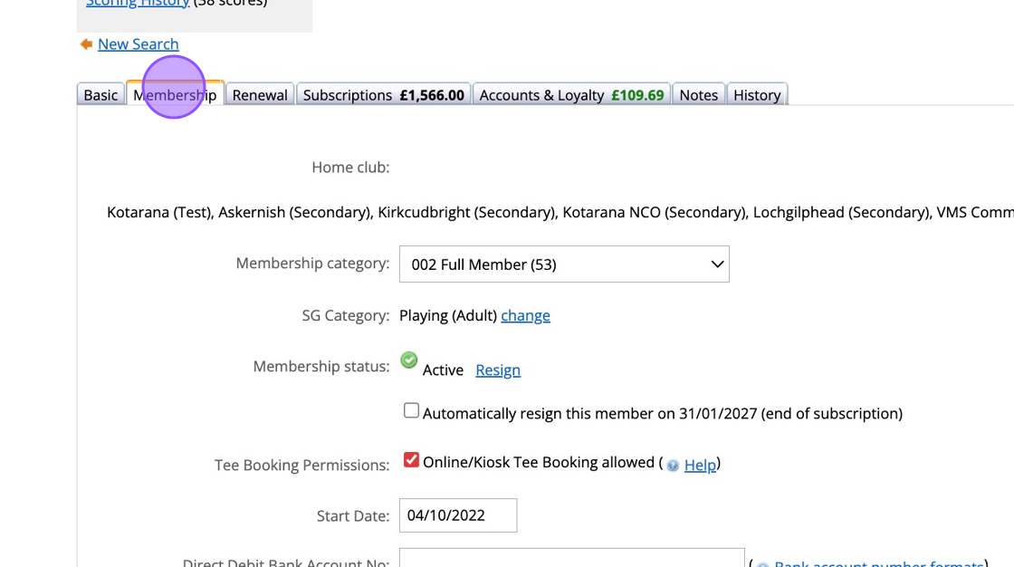 Recording a Subscription Payment on the Scottish Golf Clubhouse in a Members Profile